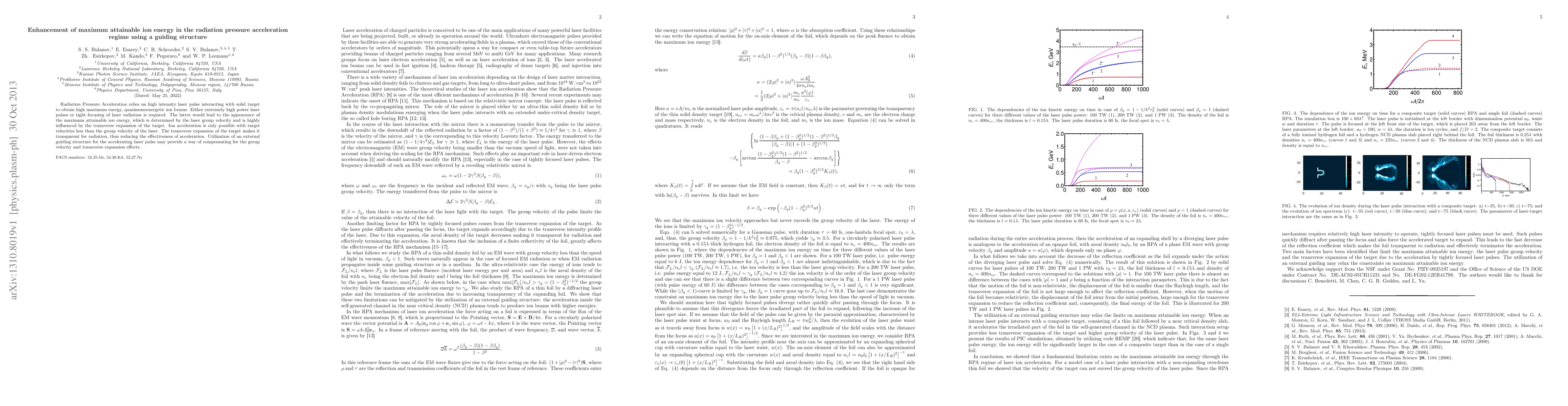 This paper explores enhancing maximum ion energy in radiation pressure acceleration by using an external guiding structure to compensate for the effects of laser group velocity and target transverse expansion. The guiding structure aims to maintain effective acceleration despite these challenges.