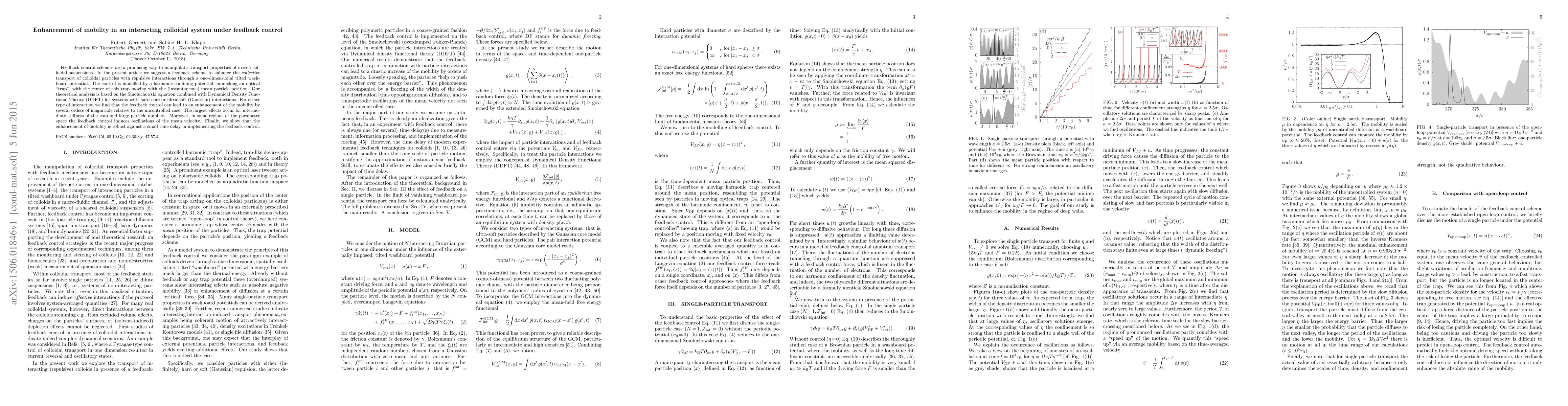 This paper proposes a feedback control scheme to significantly enhance the mobility of interacting colloidal particles in a one-dimensional washboard potential. The control mechanism, modeled by a moving harmonic trap, leads to substantial mobility improvements, especially for intermediate trap stiffness and large particle numbers, and is robust against minor delays in feedback implementation.