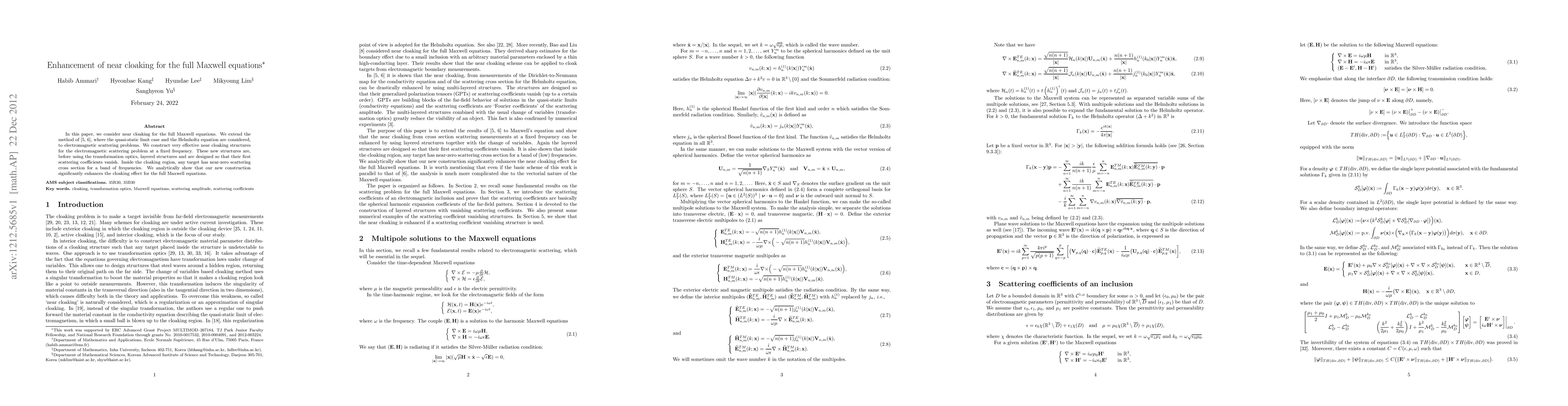 In this paper, we consider near cloaking for the full Maxwell equations. We extend the recent results, where the quasi-static limit case and the Helmholtz equation are considered, to electromagnetic scattering problems. We construct very effective near cloaking structures for the electromagnetic scattering problem at a fixed frequency. These new structures are, before using the transformation optics, layered structures and are designed so that their first scattering coefficients vanish. Inside the cloaking region, any target has near-zero scattering cross section for a band of frequencies. We analytically show that our new construction significantly enhances the cloaking effect for the full Maxwell equations.