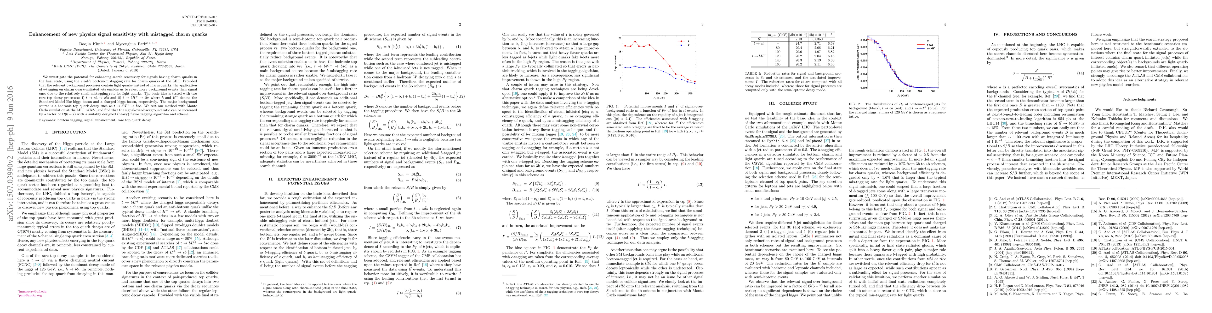 We investigate the potential for enhancing search sensitivity for signals having charm quarks in the final state, using the sizable bottom-mistagging rate for charm quarks at the LHC. Provided that the relevant background processes contain light quarks instead of charm quarks, the application of b-tagging on charm quark-initiated jets enables us to reject more background events than signal ones due to the relatively small mistagging rate for light quarks. The basic idea is tested with two rare top decay processes: i) t -> c h -> c b bbar and ii) t -> b H+ -> b bbar c where h and H+ denote the Standard Model-like higgs boson and a charged higgs boson, respectively. The major background source is a hadronic top quark decay such as t -> b W+ -> b sbar c. We test our method with Monte Carlo simulation at the LHC 14TeV, and find that the signal-over-background ratio can be increased by a factor of O(6-7) with a suitably designed (heavy) flavor tagging algorithm and scheme.