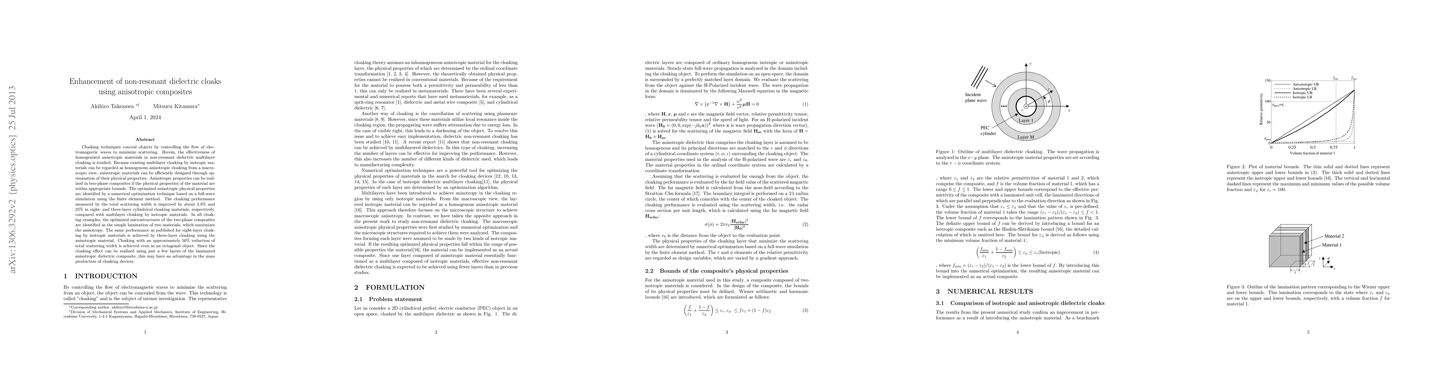 Cloaking techniques conceal objects by controlling the flow of electromagnetic waves to minimize scattering. Herein, the effectiveness of homogenized anisotropic materials in non-resonant dielectric multilayer cloaking is studied. Because existing multilayer cloaking by isotropic materials can be regarded as homogenous anisotropic cloaking from a macroscopic view, anisotropic materials can be efficiently designed through optimization of their physical properties. Anisotropic properties can be realized in two-phase composites if the physical properties of the material are within appropriate bounds. The optimized anisotropic physical properties are identified by a numerical optimization technique based on a full-wave simulation using the finite element method. The cloaking performance measured by the total scattering width is improved by about 2.8% and 25% in eight- and three-layer cylindrical cloaking materials, respectively, compared with multilayer cloaking by isotropic materials. In all cloaking examples, the optimized microstructures of the two-phase composites are identified as the simple lamination of two materials, which maximizes the anisotropy. The same performance as published for eight-layer cloaking by isotropic materials is achieved by three-layer cloaking using the anisotropic material. Cloaking with an approximately 50% reduction of total scattering width is achieved even in an octagonal object. Since the cloaking effect can be realized using just a few layers of the laminated anisotropic dielectric composite, this may have an advantage in the mass production of cloaking devices.