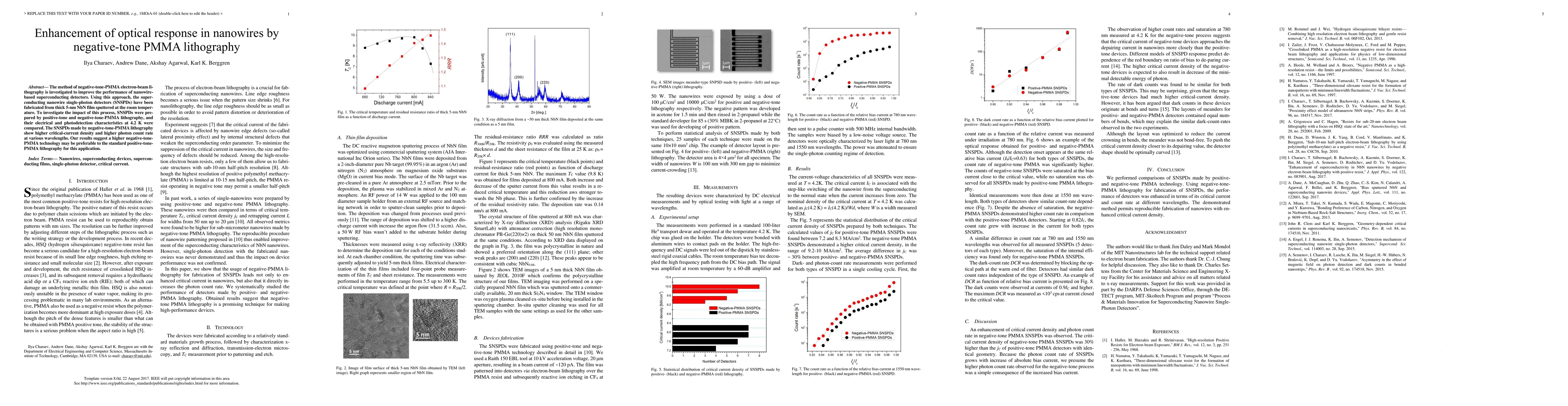 The research explores the use of negative-tone PMMA electron-beam lithography for enhancing superconducting nanowire single-photon detectors (SNSPDs). Comparing SNSPDs made with positive-tone and negative-tone PMMA lithography, the study finds that the latter exhibits higher critical-current density and photon count rate at various wavelengths, suggesting it as a preferable method for SNSPD fabrication.