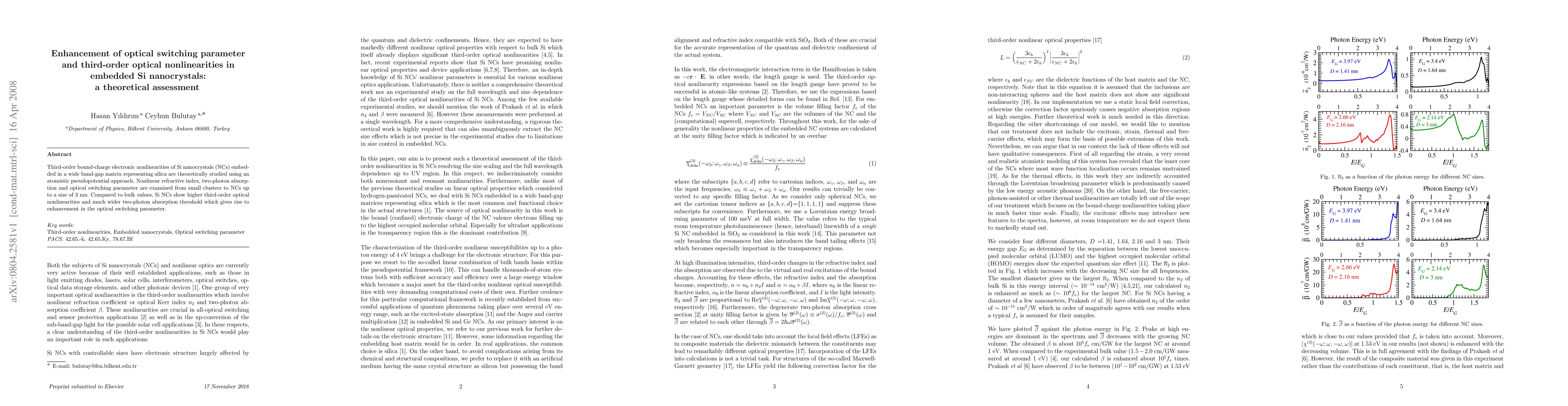 This paper theoretically investigates the enhanced third-order optical nonlinearities in Si nanocrystals embedded in silica, revealing higher nonlinear refractive index and improved optical switching parameters compared to bulk silicon. The study uses an atomistic pseudopotential approach to analyze these properties from small clusters to 3 nm nanocrystals.