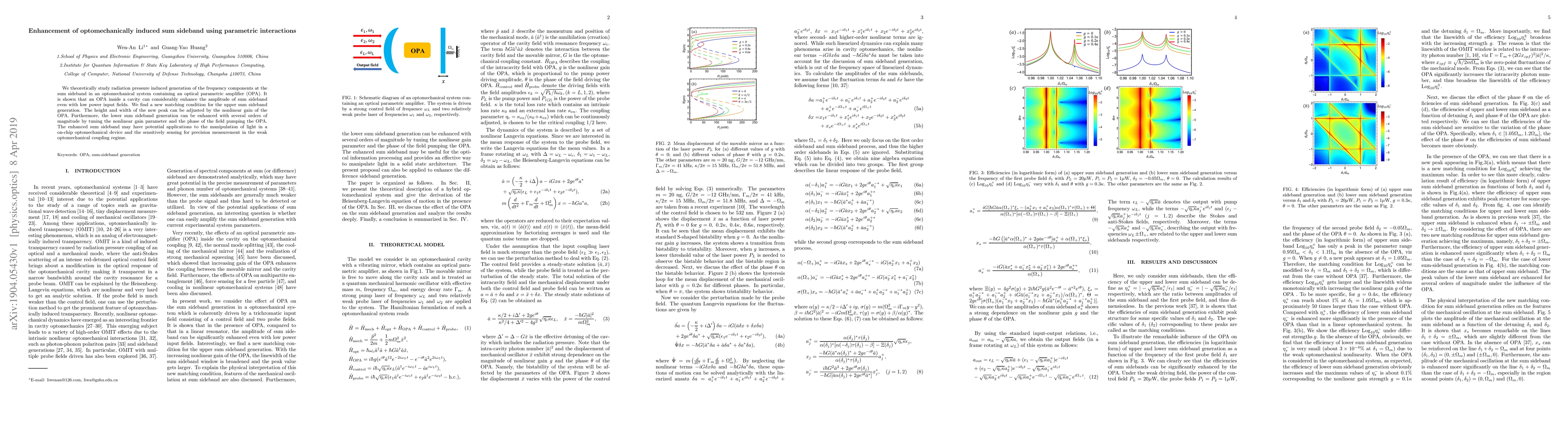 We theoretically study radiation pressure induced generation of the frequency components at the sum sideband in an optomechanical system containing an optical parametric amplifier (OPA). It is shown that an OPA inside a cavity can considerably enhance the amplitude of sum sideband even with low power input fields. We find a new matching condition for the upper sum sideband generation. The height and width of the new peak can be adjusted by the nonlinear gain of the OPA. Furthermore, the lower sum sideband generation can be enhanced with several orders of magnitude by tuning the nonlinear gain parameter and the phase of the field pumping the OPA. The enhanced sum sideband may have potential applications to the manipulation of light in a on-chip optomechanical device and the sensitively sensing for precision measurement in the weak optomechanical coupling regime.