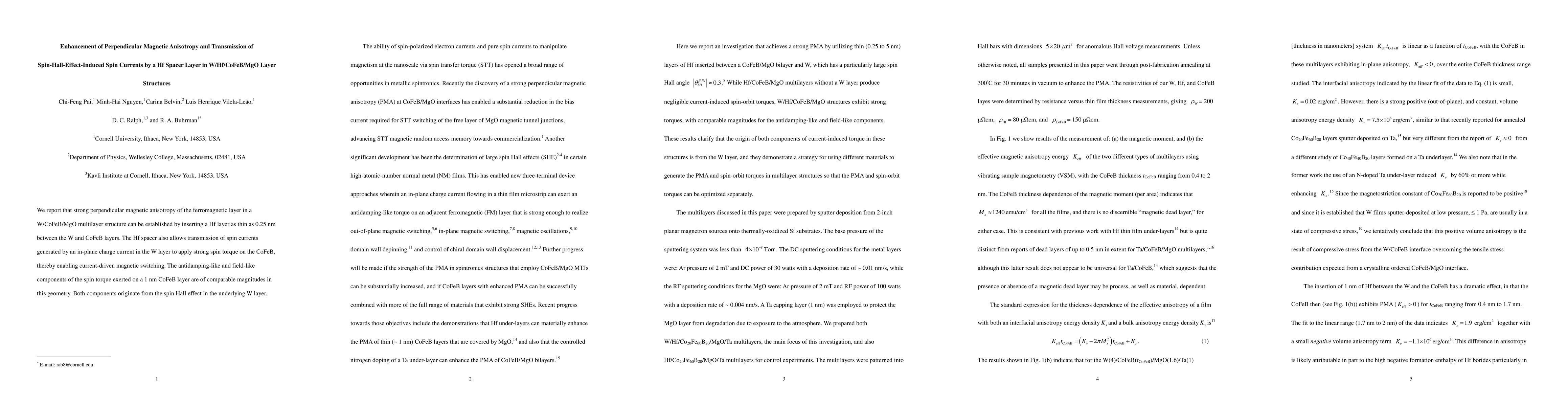 This paper demonstrates that inserting a 0.25 nm Hf spacer layer between W and CoFeB enhances perpendicular magnetic anisotropy in W/CoFeB/MgO multilayers. The Hf layer facilitates the transmission of spin currents from W to CoFeB, enabling current-driven magnetic switching via comparable antidamping-like and field-like spin torque components generated by the spin Hall effect.