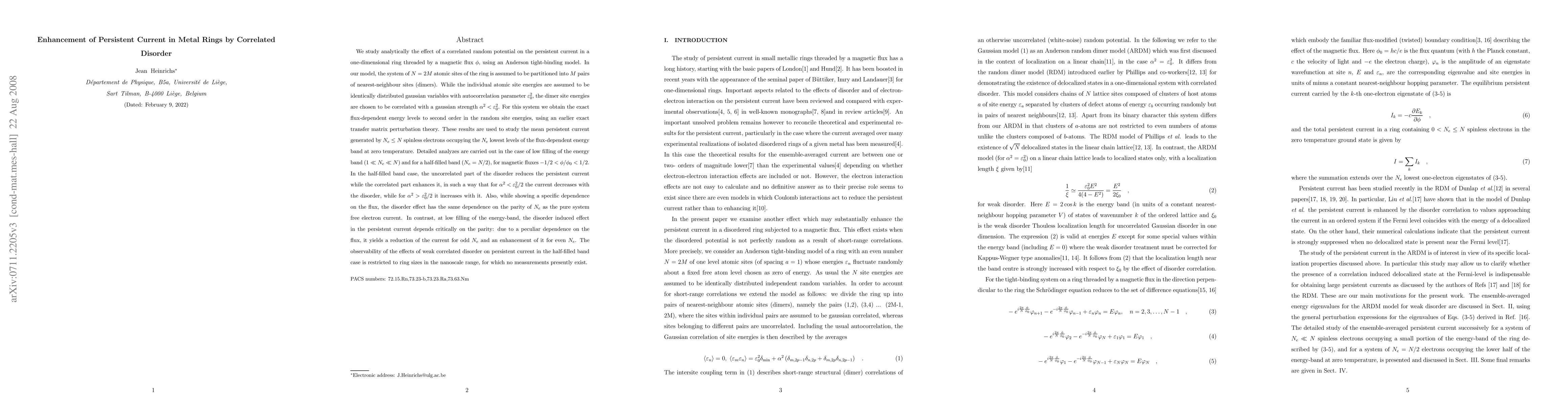 This paper analytically investigates how correlated disorder affects the persistent current in a one-dimensional ring using an Anderson tight-binding model with dimerized sites. It finds that while uncorrelated disorder reduces the persistent current, correlated disorder enhances it, especially in half-filled bands, with a parity-dependent effect at low fillings.