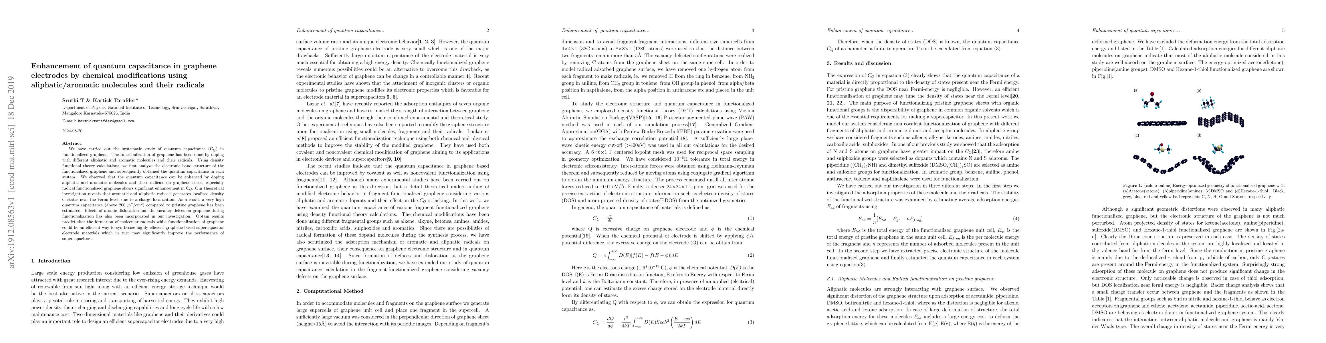 This study investigates the enhancement of quantum capacitance in graphene electrodes through doping with aliphatic and aromatic molecules and their radicals, revealing significant improvements in capacitance, especially with radical functionalization, due to localized charge density near the Fermi level. Theoretical calculations suggest these modifications could lead to highly efficient supercapacitor electrode materials.