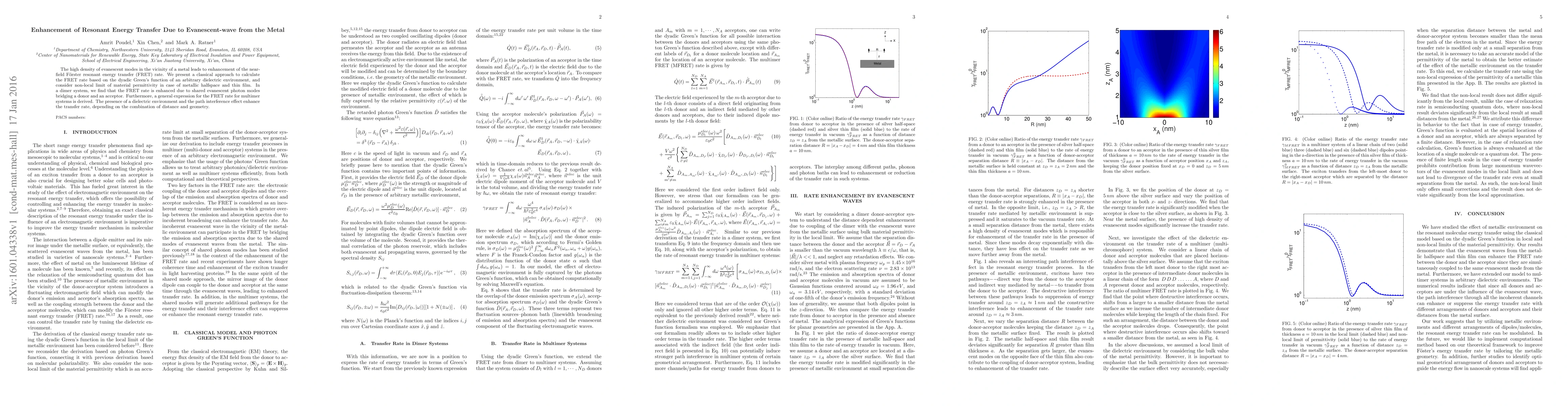The high density of evanescent modes in the vicinity of a metal leads to enhancement of the near-field F\"{o}rster resonant energy transfer (FRET) rate. We present a classical approach to calculate the FRET rate based on the dyadic Green's function of an arbitrary dielectric environment, and consider non-local limit of material permittivity in case of metallic halfspace and thin film. In a dimer system, we find that the FRET rate is enhanced due to shared evanescent photon modes bridging a donor and an acceptor. Furthermore, a general expression for the FRET rate for multimer systems is derived. The presence of a dielectric environment and the path interference effect enhance the transfer rate, depending on the combination of distance and geometry.