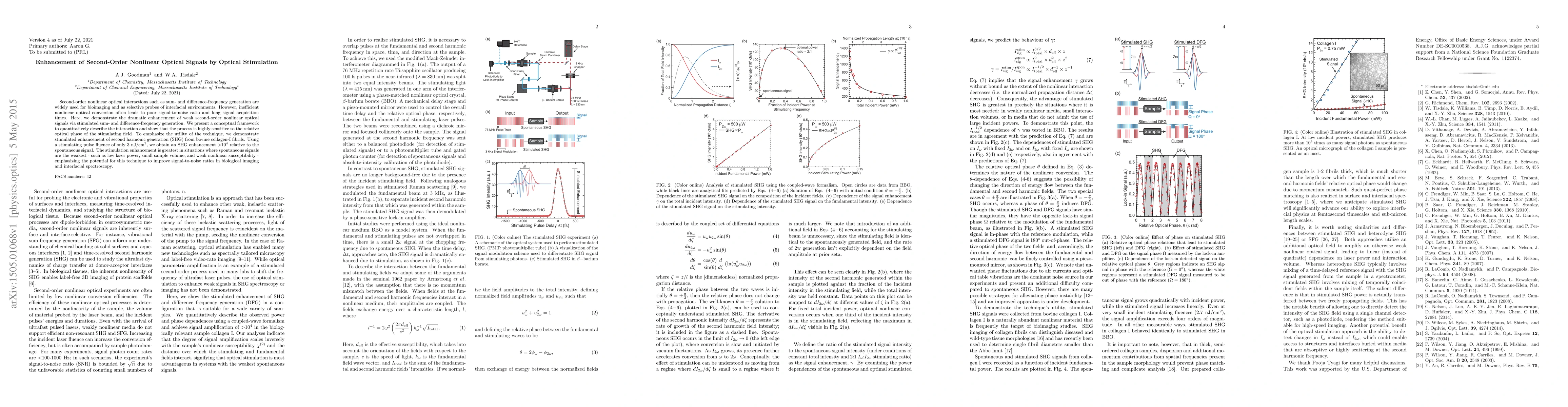 This research demonstrates a significant enhancement of weak second-order nonlinear optical signals through stimulated sum- and difference-frequency generation, achieving an enhancement factor of over 10^4 in second harmonic generation from collagen-I fibrils using minimal stimulating pulse fluence, thereby improving signal-to-noise ratios in bioimaging and spectroscopy.
