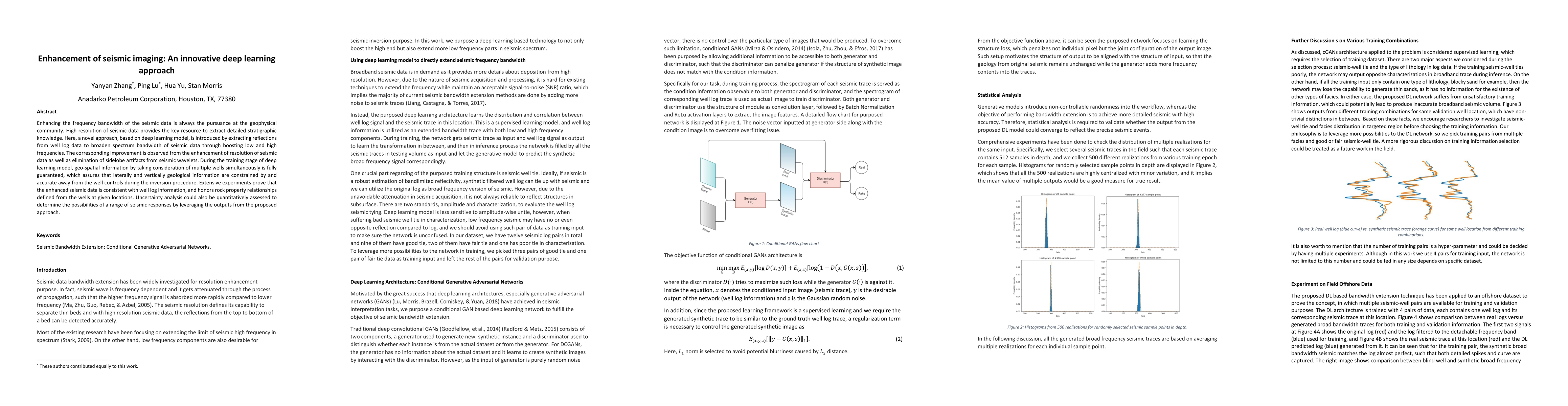 Enhancing the frequency bandwidth of the seismic data is always the pursuance at the geophysical community. High resolution of seismic data provides the key resource to extract detailed stratigraphic knowledge. Here, a novel approach, based on deep learning model, is introduced by extracting reflections from well log data to broaden spectrum bandwidth of seismic data through boosting low and high frequencies. The corresponding improvement is observed from the enhancement of resolution of seismic data as well as elimination of sidelobe artifacts from seismic wavelets. During the training stage of deep learning model, geo-spatial information by taking consideration of multiple wells simultaneously is fully guaranteed, which assures that laterally and vertically geological information are constrained by and accurate away from the well controls during the inversion procedure. Extensive experiments prove that the enhanced seismic data is consistent with well log information, and honors rock property relationships defined from the wells at given locations. Uncertainty analysis could also be quantitatively assessed to determine the possibilities of a range of seismic responses by leveraging the outputs from the proposed approach.