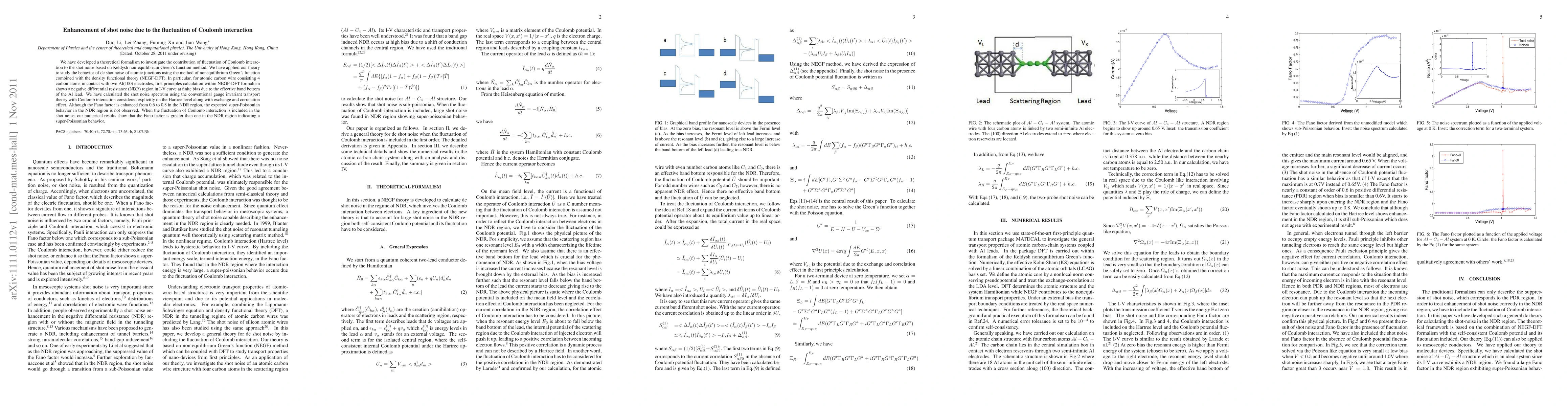 We have developed a theoretical formalism to investigate the contribution of fluctuation of Coulomb interaction to the shot noise based on Keldysh non-equilibrium Green's function method. We have applied our theory to study the behavior of dc shot noise of atomic junctions using the method of nonequilibrium Green's function combined with the density functional theory (NEGF-DFT). In particular, for atomic carbon wire consisting 4 carbon atoms in contact with two Al(100) electrodes, first principles calculation within NEGF-DFT formalism shows a negative differential resistance (NDR) region in I-V curve at finite bias due to the effective band bottom of the Al lead. We have calculated the shot noise spectrum using the conventional gauge invariant transport theory with Coulomb interaction considered explicitly on the Hartree level along with exchange and correlation effect. Although the Fano factor is enhanced from 0.6 to 0.8 in the NDR region, the expected super-Poissonian behavior in the NDR regionis not observed. When the fluctuation of Coulomb interaction is included in the shot noise, our numerical results show that the Fano factor is greater than one in the NDR region indicating a super-Poissonian behavior.