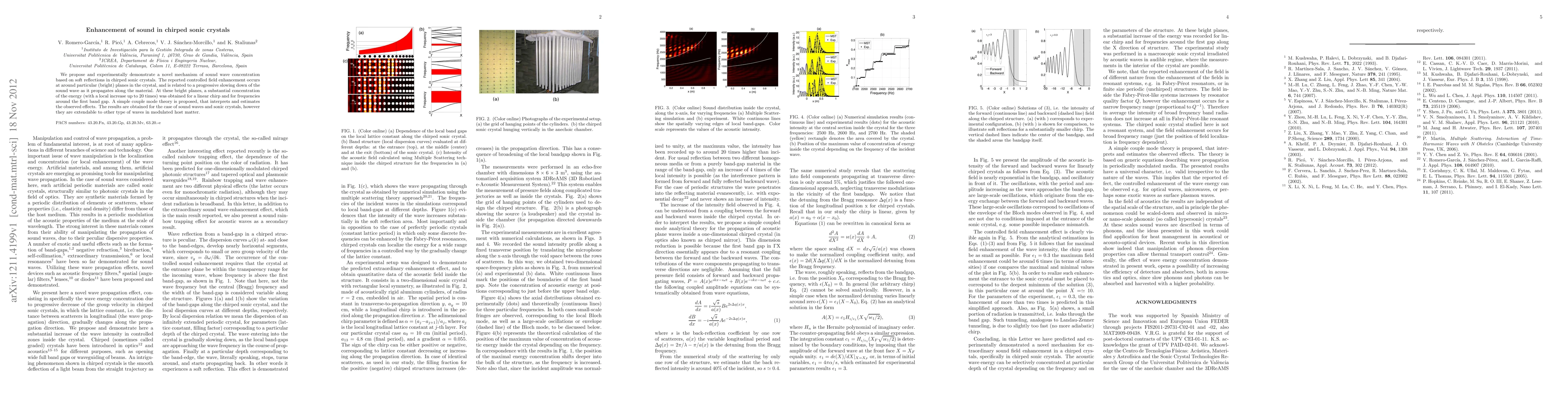 This paper proposes a novel mechanism for enhancing sound waves in chirped sonic crystals through soft reflections, achieving up to a 20-fold energy concentration at specific planes. The observed effects are explained by a simple couple mode theory and are applicable to other types of waves in modulated media.