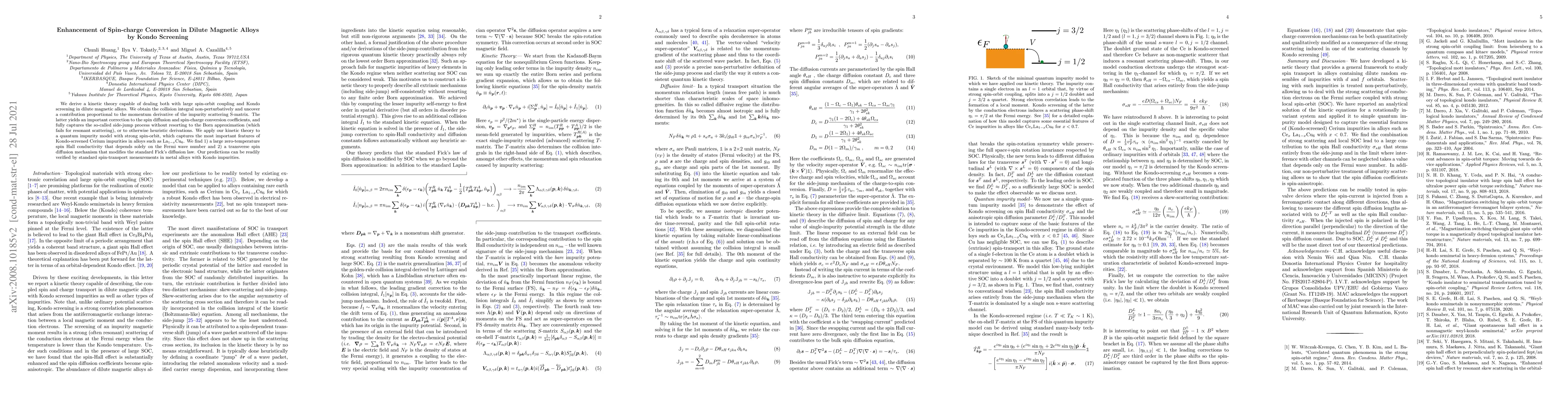 This paper develops a kinetic theory to describe spin-charge conversion in dilute magnetic alloys, revealing significant corrections due to Kondo screening and the side-jump mechanism. The theory predicts a large zero-temperature spin Hall conductivity and a modified spin diffusion law, applicable to alloys like La$_{1-x}$Cu$_6$.