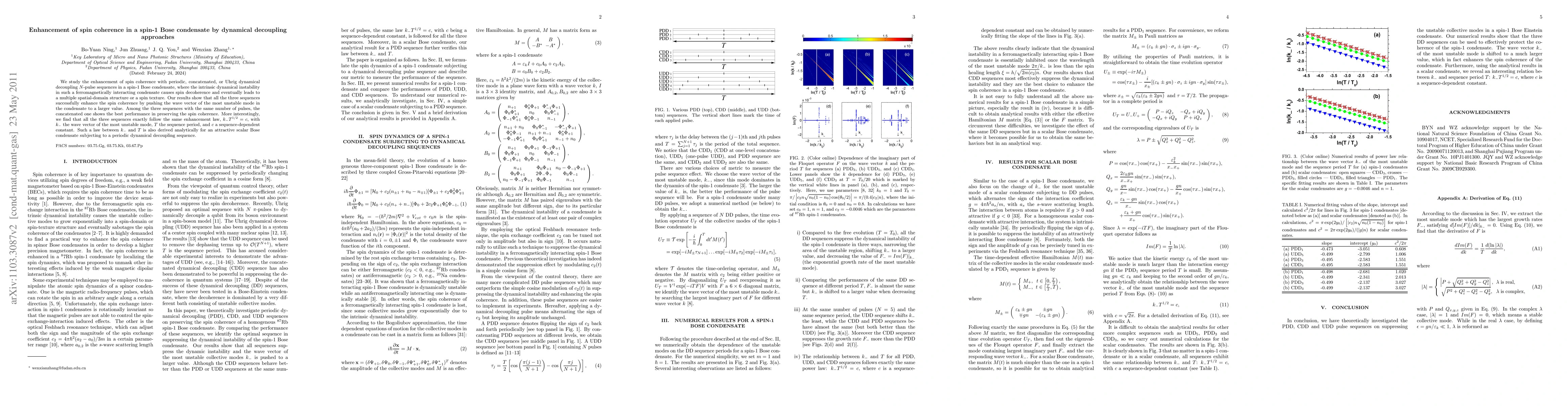 This study investigates the enhancement of spin coherence in a $^{87}$Rb spin-1 Bose condensate using periodic, concatenated, and Uhrig dynamical decoupling $N$-pulse sequences. The concatenated sequence proves most effective in preserving spin coherence, while all three follow a common enhancement law.