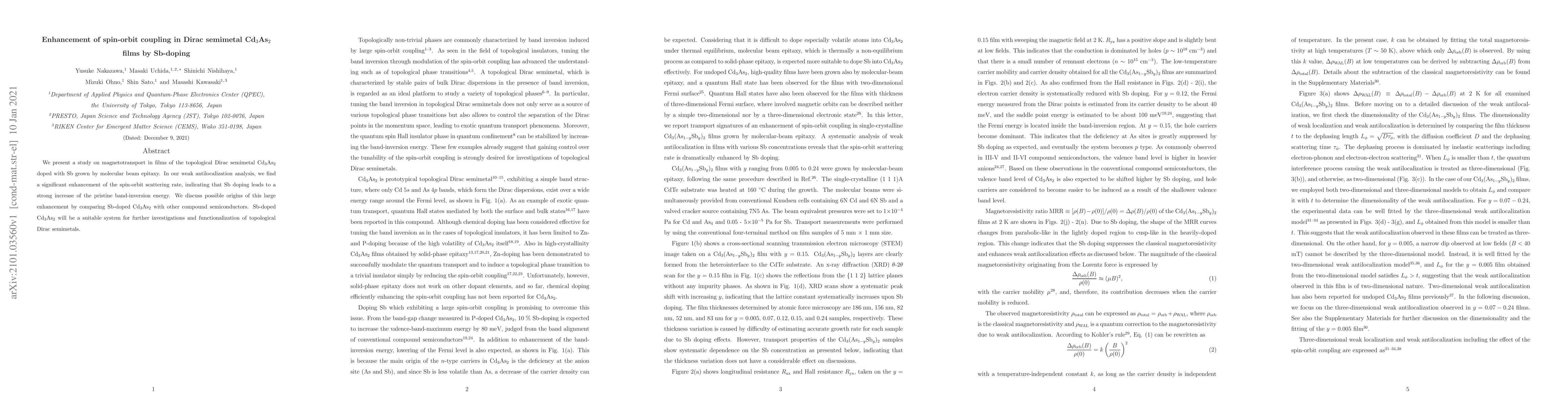 We present a study on magnetotransport in films of the topological Dirac semimetal Cd$_{3}$As$_{2}$ doped with Sb grown by molecular beam epitaxy. In our weak antilocalization analysis, we find a significant enhancement of the spin-orbit scattering rate, indicating that Sb doping leads to a strong increase of the pristine band-inversion energy. We discuss possible origins of this large enhancement by comparing Sb-doped Cd$_{3}$As$_{2}$ with other compound semiconductors. Sb-doped Cd$_{3}$As$_{2}$ will be a suitable system for further investigations and functionalization of topological Dirac semimetals.