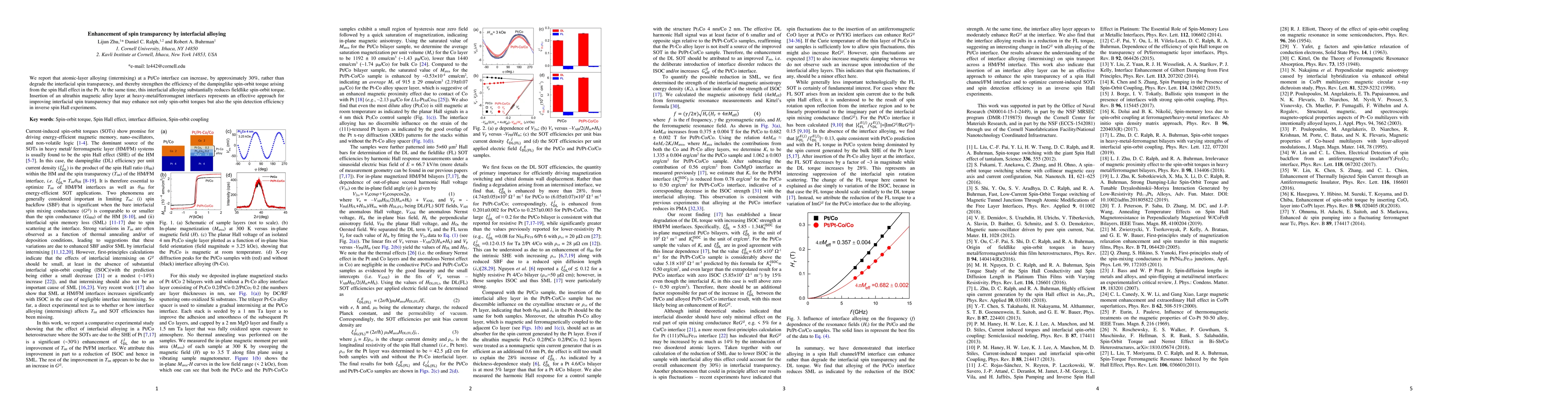 This paper demonstrates that atomic-layer alloying at a Pt/Co interface enhances spin transparency by 30%, improving the efficiency of dampinglike spin-orbit torques while reducing fieldlike spin-orbit torque. This method of interfacial alloying could boost spin-orbit torques and spin detection efficiency in spin Hall experiments.