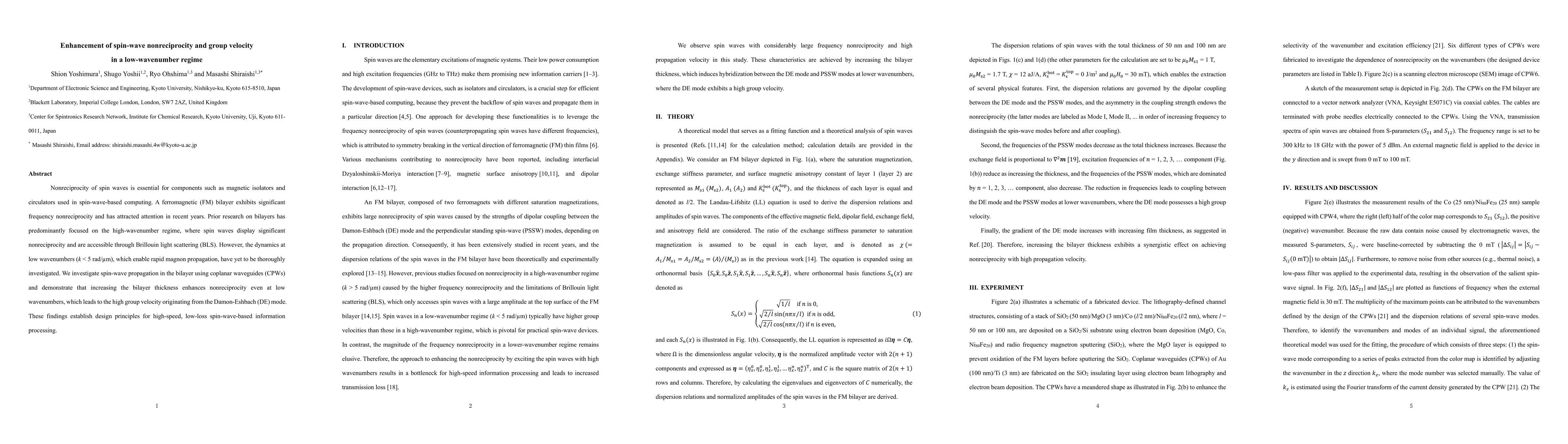 Nonreciprocity of spin waves is essential for components such as magnetic isolators and circulators used in spin-wave-based computing. A ferromagnetic (FM) bilayer exhibits significant frequency nonreciprocity and has attracted attention in recent years. Prior research on bilayers has predominantly focused on the high-wavenumber regime, where spin waves display significant nonreciprocity and are accessible through Brillouin light scattering (BLS). However, the dynamics at low wavenumbers (k < 5 rad/um), which enable rapid magnon propagation, have yet to be thoroughly investigated. We investigate spin-wave propagation in the bilayer using coplanar waveguides (CPWs) and demonstrate that increasing the bilayer thickness enhances nonreciprocity even at low wavenumbers, which leads to the high group velocity originating from the Damon-Eshbach (DE) mode. These findings establish design principles for high-speed, low-loss spin-wave-based information processing.