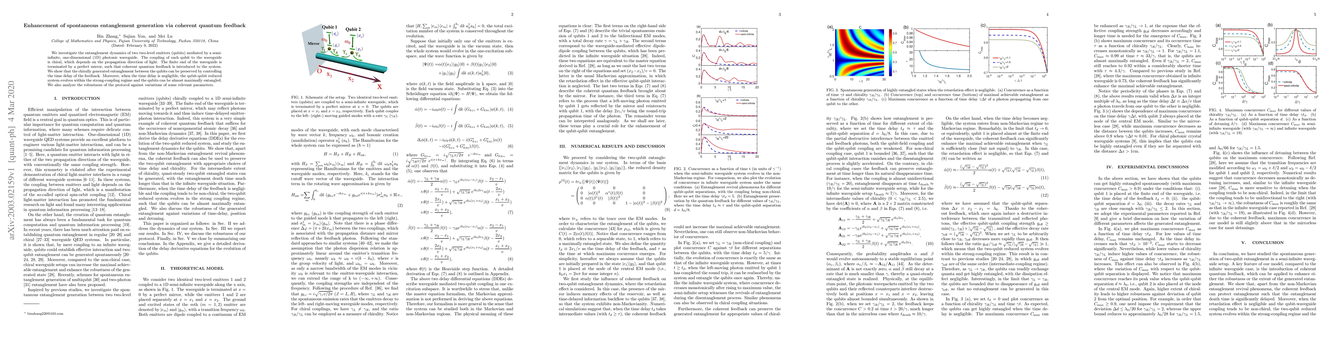 This paper explores how coherent quantum feedback through a chirally coupled photonic waveguide can enhance spontaneous entanglement generation between two qubits. The study finds that controlling the time delay of the feedback preserves chiral entanglement and can lead to almost maximal entanglement when the delay is minimal.