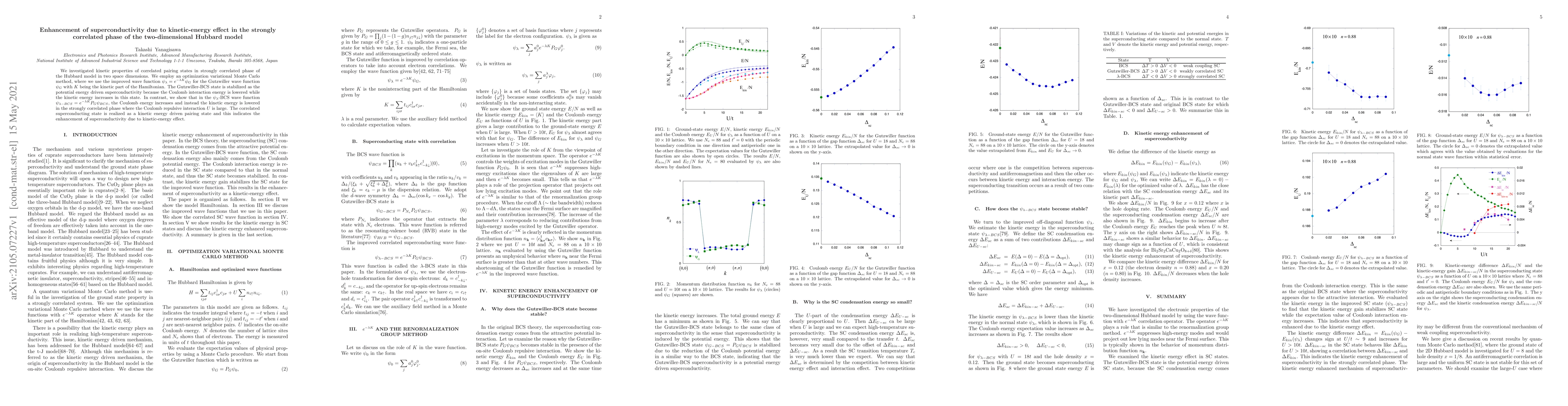 We investigated kinetic properties of correlated pairing states in strongly correlated phase of the Hubbard model in two space dimensions. We employ an optimization variational Monte Carlo method, where we use the improved wave function $\psi_{\lambda}= e^{-\lambda K}\psi_G$ for the Gutzwiller wave function $\psi_G$ with $K$ being the kinetic part of the Hamiltonian. The Gutzwiller-BCS state is stabilized as the potential energy driven superconductivity because the Coulomb interaction energy is lowered while the kinetic energy increases in this state. In contrast, we show that in the $\psi_{\lambda}$-BCS wave function $\psi_{\lambda-BCS}= e^{-\lambda K}P_G\psi_{BCS}$, the Coulomb energy increases and instead the kinetic energy is lowered in the strongly correlated phase where the Coulomb repulsive interaction $U$ is large. The correlated superconducting state is realized as a kinetic energy driven pairing state and this indicates the enhancement of superconductivity due to kinetic-energy effect.