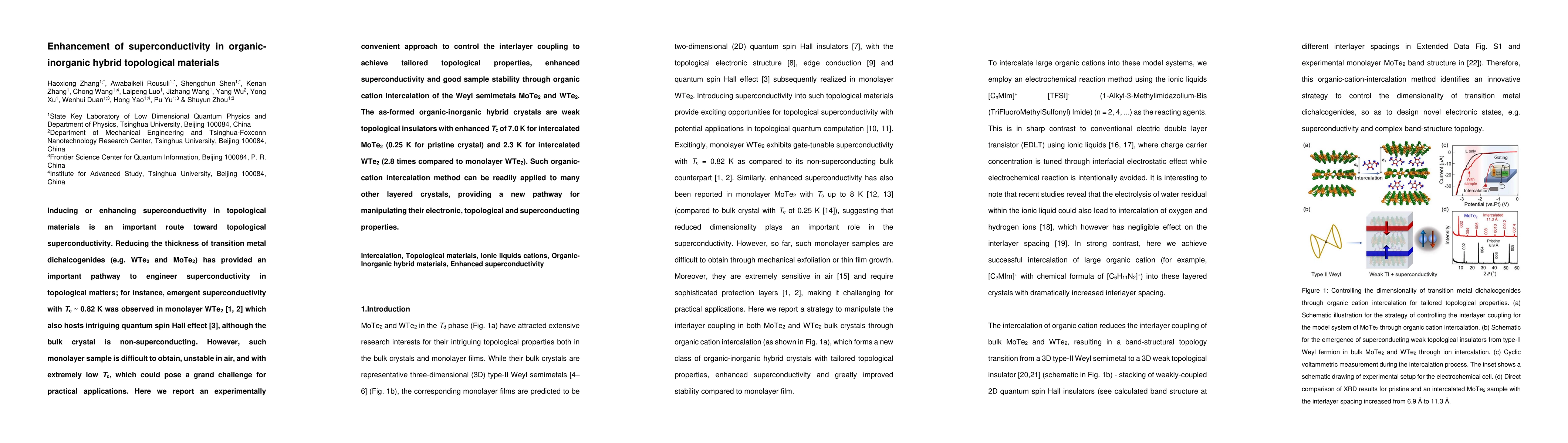 This paper reports an approach to enhance superconductivity in topological materials by intercalating organic cations into Weyl semimetals MoTe2 and WTe2, achieving Tc enhancements to 7.0 K for MoTe2 and 2.3 K for WTe2, and demonstrating a practical method for manipulating electronic and topological properties in layered crystals.