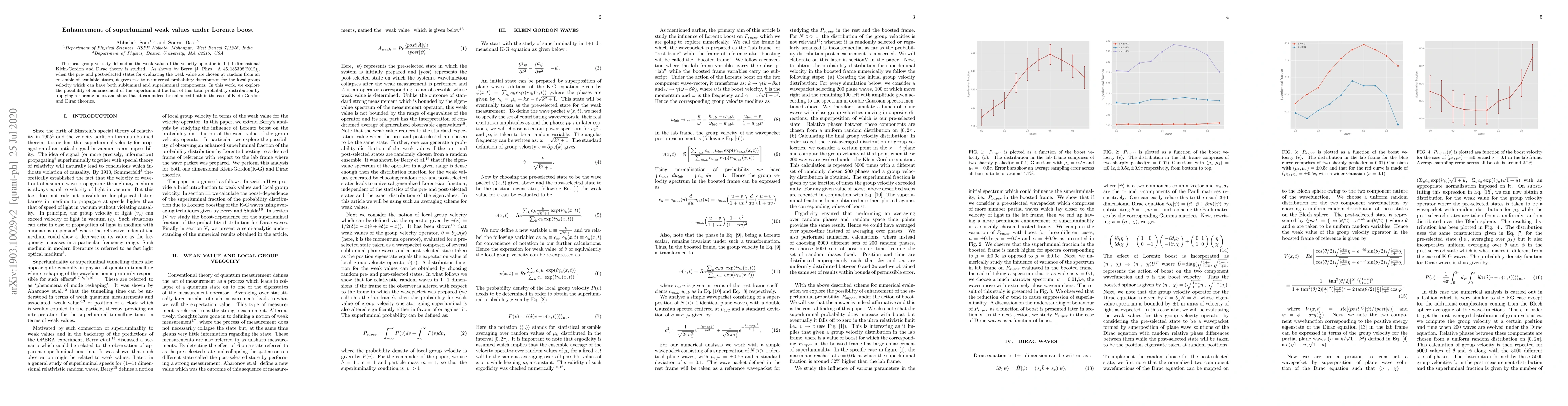 We study the local group velocity defined as the weak value of the velocity operator in the (1+1) dimensional Klein-Gordon as well as Dirac theory. It was shown by Berry [ J. Phys. A 45, 185308 (2012)] that when the pre- and post-selected states for evaluating the weak value are chosen at random from an ensemble of available states, the local group velocity has a universal probability distribution which can have both subluminal and superluminal components. In this work, we numerically explore the role of Lorentz boost and its impact on the superluminal fraction of the total probability distribution. We show that the dependence (enhancement) of the superluminal fraction on Lorentz boost of the total probability distribution differs both qualitatively and quantitatively for the Klein-Gordon waves and Dirac waves. For the Klein-Gordan waves, the asymmetry in the distribution of group velocities around the zero velocity point in the laboratory frame is entirely responsible for the observation of relative enhancement in the boosted frame. On the other hand, for the Dirac waves, we observe an enhancement irrespective of whether the laboratory frame velocity distribution is symmetric or not.
