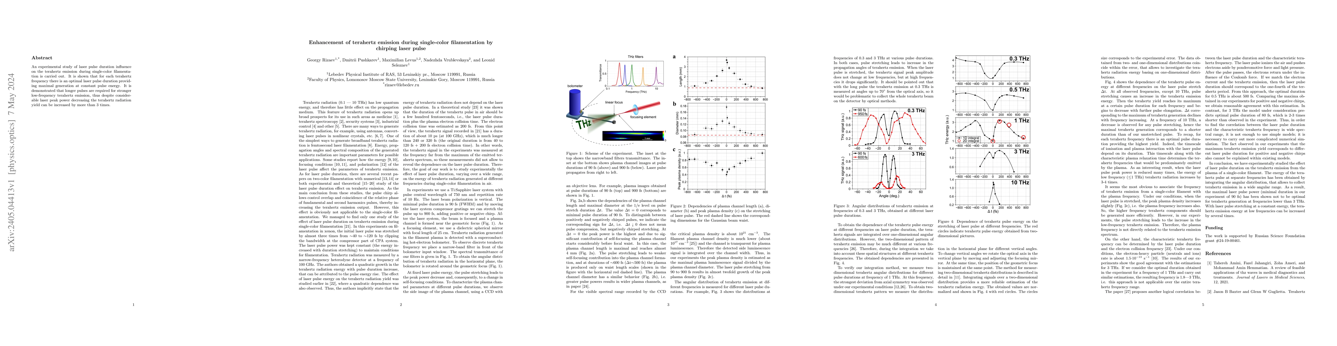 The study investigates how varying laser pulse duration affects terahertz emission during single-color filamentation, revealing an optimal pulse duration for maximal terahertz generation at constant energy. Longer pulses enhance low-frequency terahertz emission, increasing its yield by over 3 times despite reduced peak power.