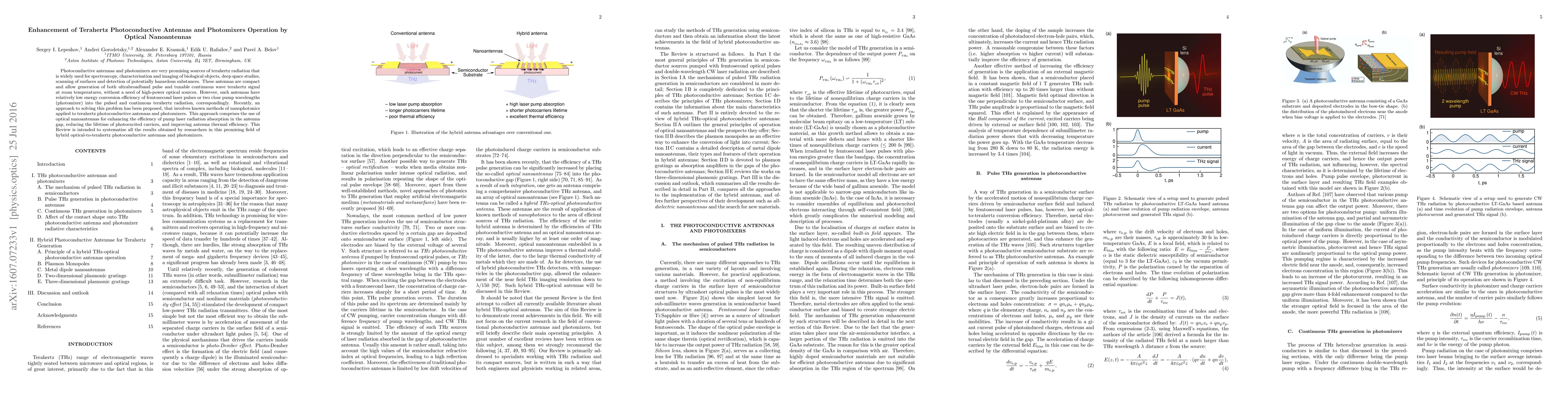 This paper reviews the enhancement of terahertz photoconductive antennas and photomixers using optical nanoantennas to boost energy conversion efficiency and improve performance for applications in spectroscopy and imaging. The study focuses on methods to increase the absorption of pump laser radiation and reduce thermal inefficiencies.