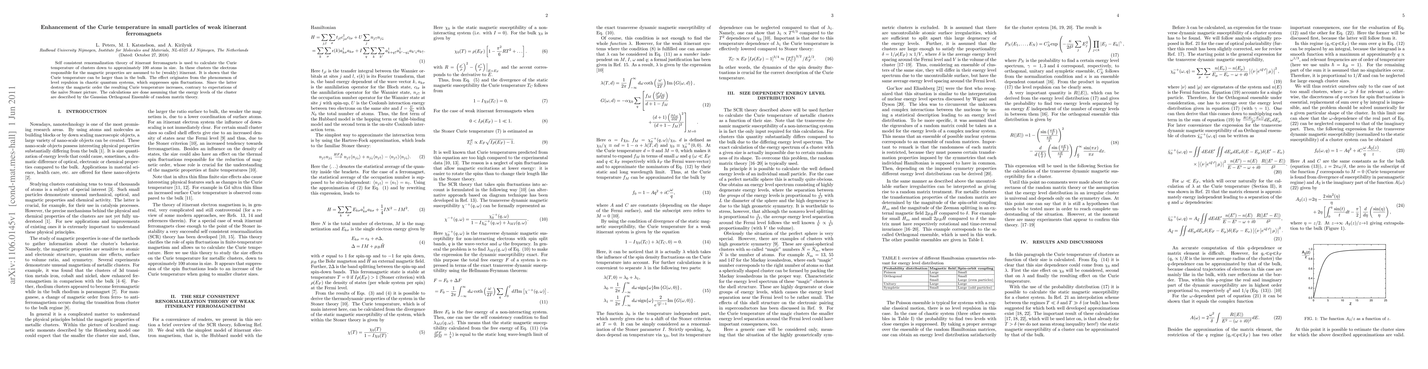 This paper uses a self-consistent renormalization theory to show that the Curie temperature in small clusters of weak itinerant ferromagnets can exceed that of the bulk material. The increase is attributed to level repulsion in chaotic quantum systems, which reduces spin fluctuations and enhances magnetic order.