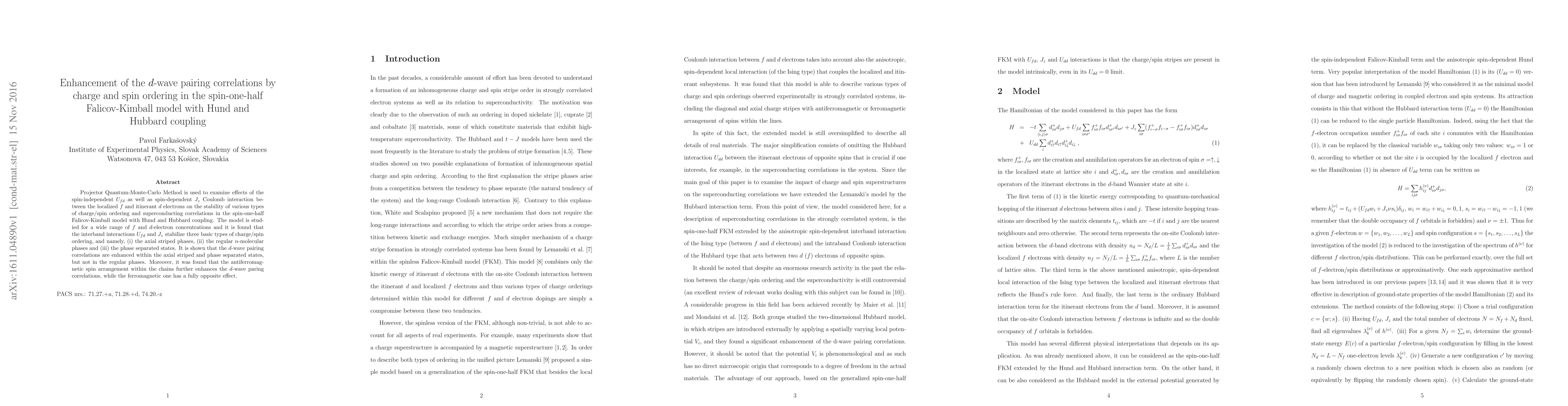 Projector Quantum-Monte-Carlo Method is used to examine effects of the spin-independent $U_{fd}$ as well as spin-dependent $J_z$ Coulomb interaction between the localized $f$ and itinerant $d$ electrons on the stability of various types of charge/spin ordering and superconducting correlations in the spin-one-half Falicov-Kimball model with Hund and Hubbard coupling. The model is studied for a wide range of $f$ and $d$-electron concentrations and it is found that the interband interactions $U_{fd}$ and $J_z$ stabilize three basic types of charge/spin ordering, and namely, (i) the axial striped phases, (ii) the regular $n$-molecular phases and (iii) the phase separated states. It is shown that the d-wave pairing correlations are enhanced within the axial striped and phase separated states, but not in the regular phases. Moreover, it was found that the antiferromagnetic spin arrangement within the chains further enhances the d-wave paring correlations, while the ferromagnetic one has a fully opposite effect.