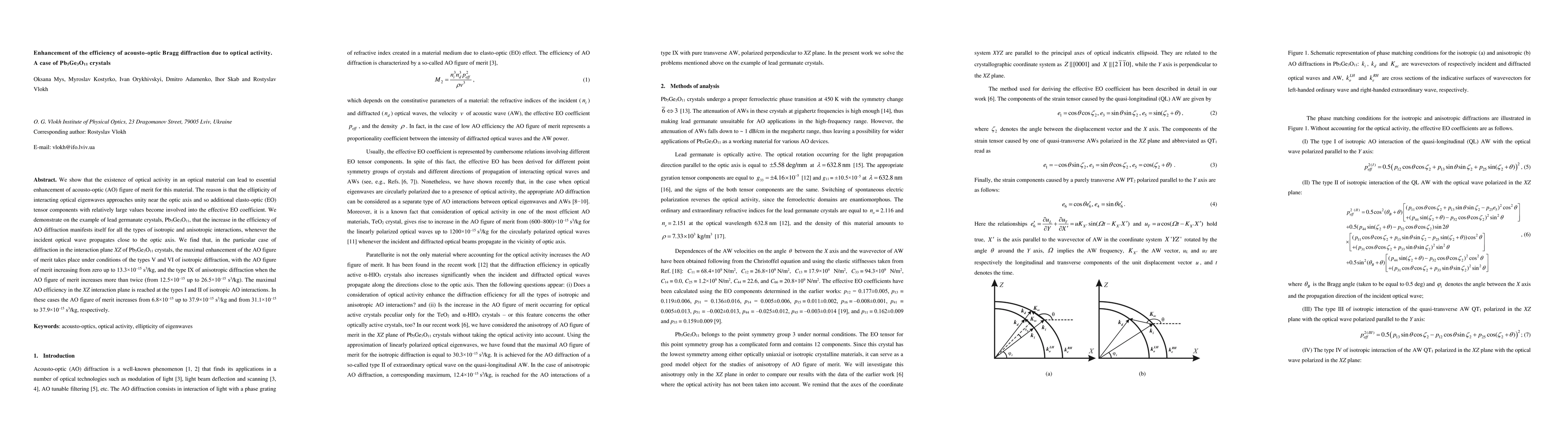 We show that the existence of optical activity in an optical material can lead to essential enhancement of acousto-optic (AO) figure of merit for this material. The reason is that the ellipticity of interacting optical eigenwaves approaches unity near the optic axis and so additional elasto-optic (EO) tensor components with relatively large values become involved into the effective EO coefficient. We demonstrate on the example of lead germanate crystals, Pb$_5$Ge$_3$O$_{11}$, that the increase in the efficiency of AO diffraction manifests itself for all the types of isotropic and anisotropic interactions, whenever the incident optical wave propagates close to the optic axis. We find that, in the particular case of diffraction in the interaction plane XZ of Pb$_5$Ge$_3$O$_{11}$ crystals, the maximal enhancement of the AO figure of merit takes place under conditions of the types V and VI of isotropic diffraction, with the AO figure of merit increasing from zero up to 13.3x10$^{-15}$ s$^3$/kg, and the type IX of anisotropic diffraction when the AO figure of merit increases more than twice (from 12.5x10$^{-15}$ up to 26.5x10$^{-15}$ s$^3$/kg). The maximal AO efficiency in the XZ interaction plane is reached at the types I and II of isotropic AO interactions. In these cases the AO figure of merit increases from 6.8x10$^{-15}$ up to 37.9x10$^{-15}$ s$^3$/kg and from 31.1x10$^{-15}$ to 37.9x10$^{-15}$ s$^3$/kg, respectively.