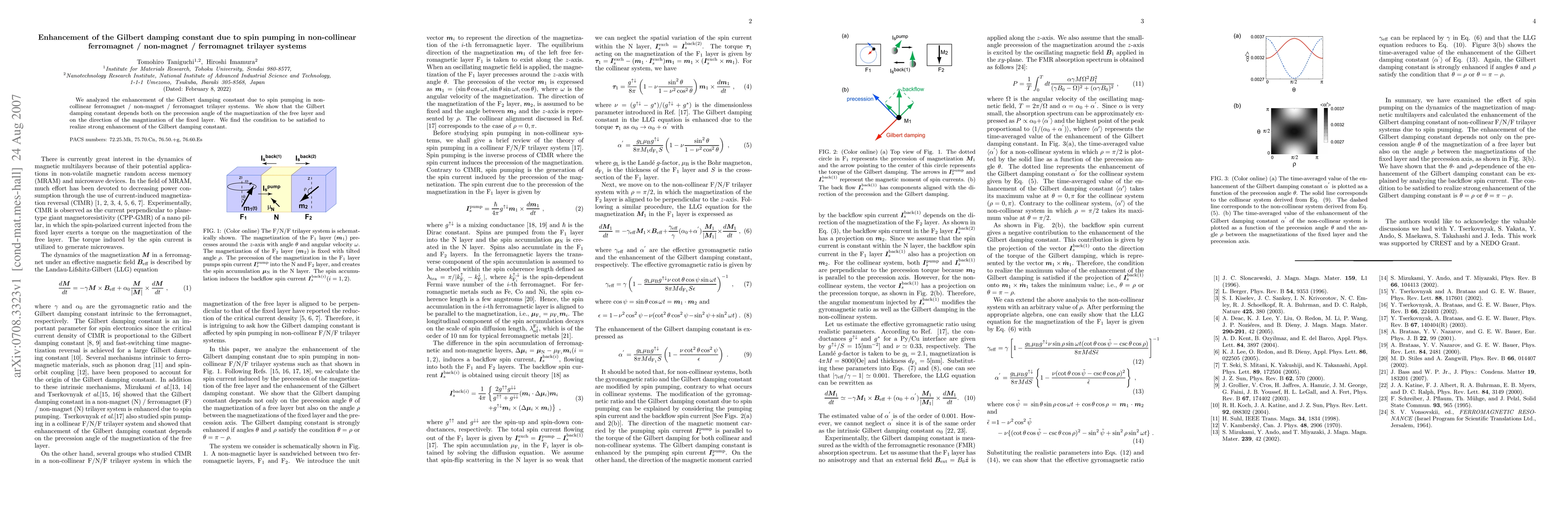 This study investigates the enhancement of the Gilbert damping constant in noncollinear ferromagnet/nonmagnet/ferromagnet trilayer systems due to spin pumping. The research reveals that the damping constant is influenced by the precession angle of the free layer's magnetization and the direction of the fixed layer's magnetization, identifying conditions for significant damping enhancement.