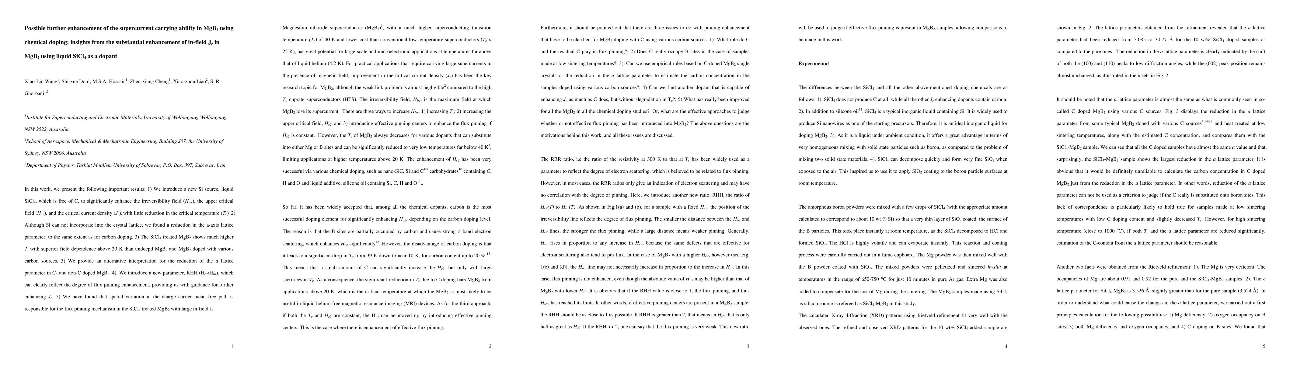In this work, we present the following important results: 1) We introduce a new Si source, liquid SiCl4, which is free of C, to significantly enhance the irreversibility field (Hirr), the upper critical field (Hc2), and the critical current density (Jc), with little reduction in the critical temperature (Tc). 2) Although Si can not incorporate into the crystal lattice, we found a reduction in the a-axis lattice parameter, to the same extent as for carbon doping. 3) The SiCl4 treated MgB2 shows much higher Jc with superior field dependence above 20 K than undoepd MgB2 and MgB2 doped with various carbon sources. 3) We provide an alternative interpretation for the reduction of the a lattice parameter in C- and non-C doped MgB2. 4). We introduce a new parameter, RHH (Hc2/Hirr), which can clearly reflect the degree of flux pinning enhancement, providing us with guidance for further enhancing Jc. 5) We have found that spatial variation in the charge carrier mean free path is responsible for the flux pinning mechanism in the SiCl4 treated MgB2 with large in-field Jc.