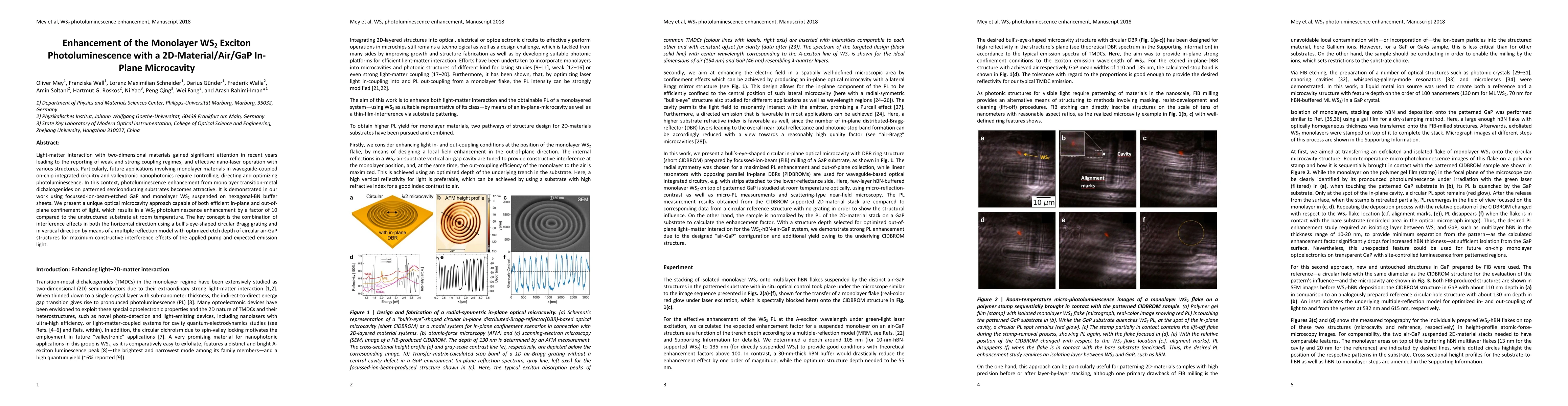 This paper demonstrates a significant enhancement of monolayer WS2 exciton photoluminescence by a factor of 10 using a 2D-material/air/GaP in-plane microcavity. The approach combines horizontal interference effects from a bull's-eye-shaped Bragg grating and vertical multiple reflections in GaP air-structures for optimal constructive interference.