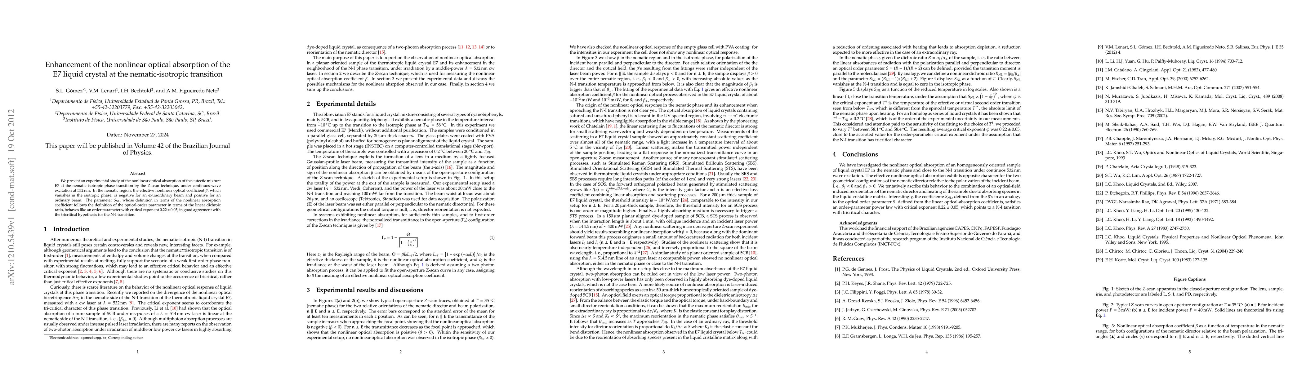 We present an experimental study of the nonlinear optical absorption of the eutectic mixture E7 at the nematic-isotropic phase transition by the Z-scan technique, under a continuos wave excitation at 532 nm. In the nematic region, the effective nonlinear optical coefficient \beta for an extraordinary beam is negative and for an ordinary beam is positive, being null in the isotropic phase. The parameter S_{NL} defined in terms of the nonlinear absorption coefficients in a similar way than the optical order parameter from the linear dichoic ratio behavies like an order parameter with a critical exponent 0.22+-0.05, in good agreement with the tri-critical hipothesis of the N-I transition.
