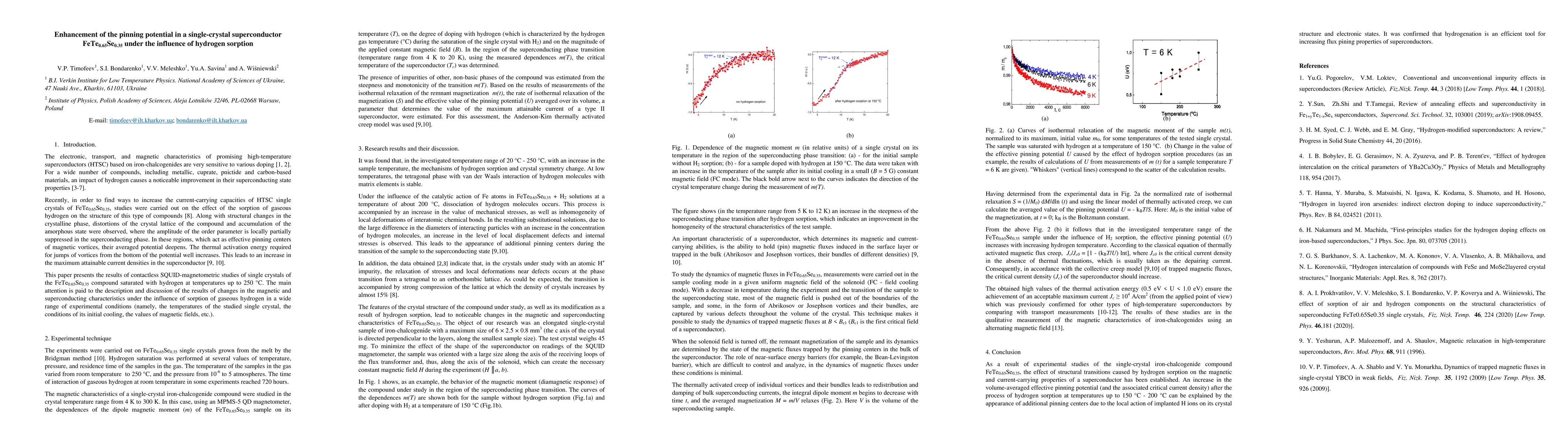 As a result of experimental studies of the single-crystal iron-chalcogenide compound FeTe0.65Se0.35, the effect of structural transitions caused by hydrogen sorption on the magnetic and current-carrying properties of a superconductor has been established. An increase in the volume-averaged effective pinning potential (and the associated critical current density) after the process of hydrogen sorption at temperatures up to 150 {\deg}C - 200 {\deg}C can be explained by the appearance of additional pinning centers due to the local action of implanted H ions on its crystal structure and electronic states. It was confirmed that hydrogenation is an efficient tool for increasing flux pining properties of superconductors.