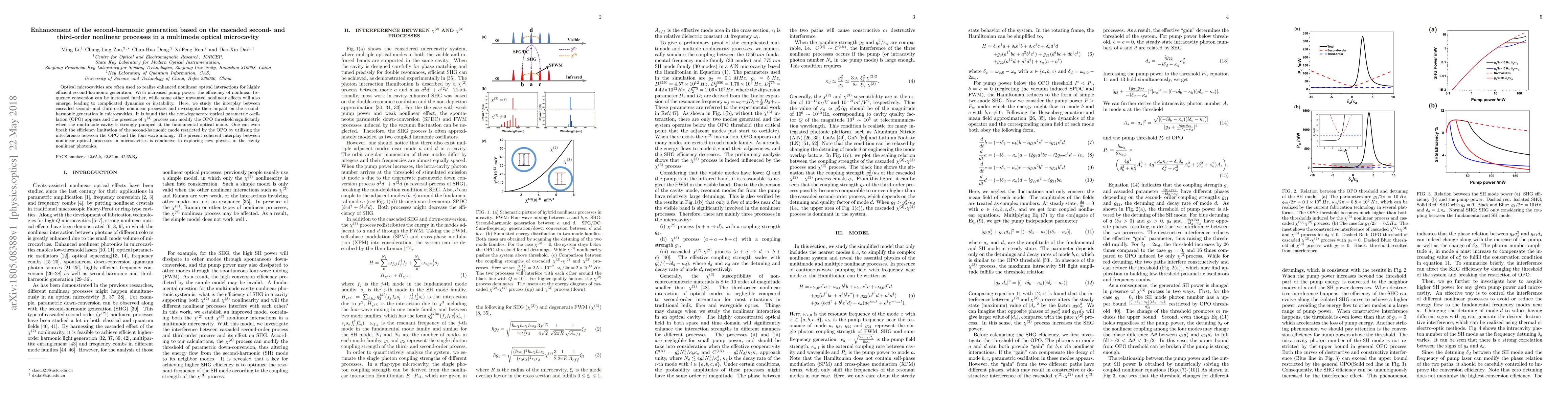 This paper investigates enhanced second-harmonic generation in optical microcavities through the interplay of cascaded second- and third-order nonlinear processes, revealing that the $\chi^{(3)}$ process modifies the optical parametric oscillation threshold and can break efficiency limitations set by the OPO.