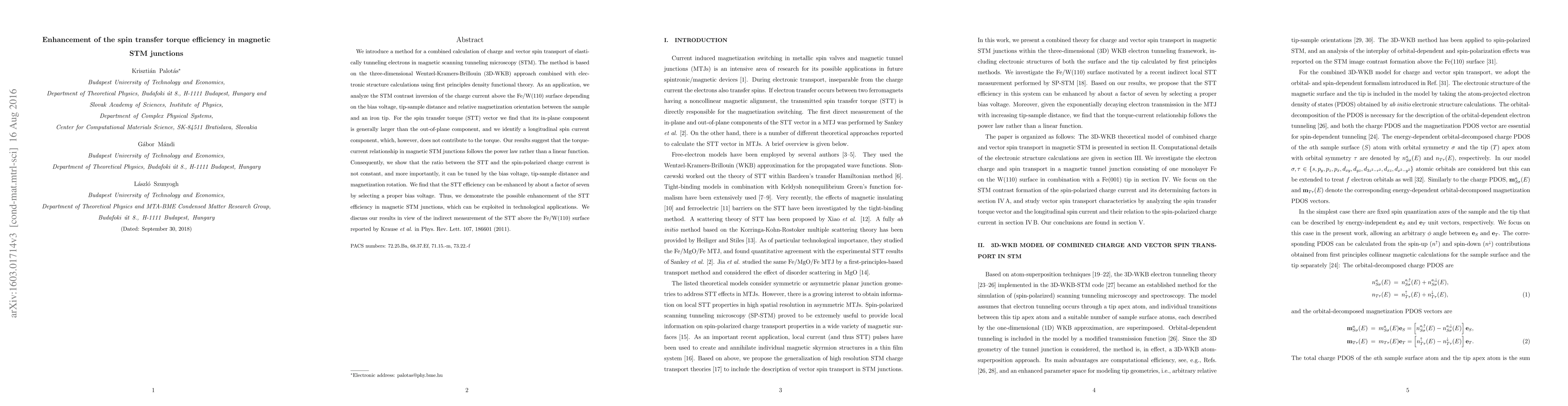 We introduce a method for a combined calculation of charge and vector spin transport of elastically tunneling electrons in magnetic scanning tunneling microscopy (STM). The method is based on the three-dimensional Wentzel-Kramers-Brillouin (3D-WKB) approach combined with electronic structure calculations using first principles density functional theory. As an application, we analyze the STM contrast inversion of the charge current above the Fe/W(110) surface depending on the bias voltage, tip-sample distance and relative magnetization orientation between the sample and an iron tip. For the spin transfer torque (STT) vector we find that its in-plane component is generally larger than the out-of-plane component, and we identify a longitudinal spin current component, which, however, does not contribute to the torque. Our results suggest that the torque-current relationship in magnetic STM junctions follows the power law rather than a linear function. Consequently, we show that the ratio between the STT and the spin-polarized charge current is not constant, and more importantly, it can be tuned by the bias voltage, tip-sample distance and magnetization rotation. We find that the STT efficiency can be enhanced by about a factor of seven by selecting a proper bias voltage. Thus, we demonstrate the possible enhancement of the STT efficiency in magnetic STM junctions, which can be exploited in technological applications. We discuss our results in view of the indirect measurement of the STT above the Fe/W(110) surface reported by Krause et al. in Phys. Rev. Lett. 107, 186601 (2011).