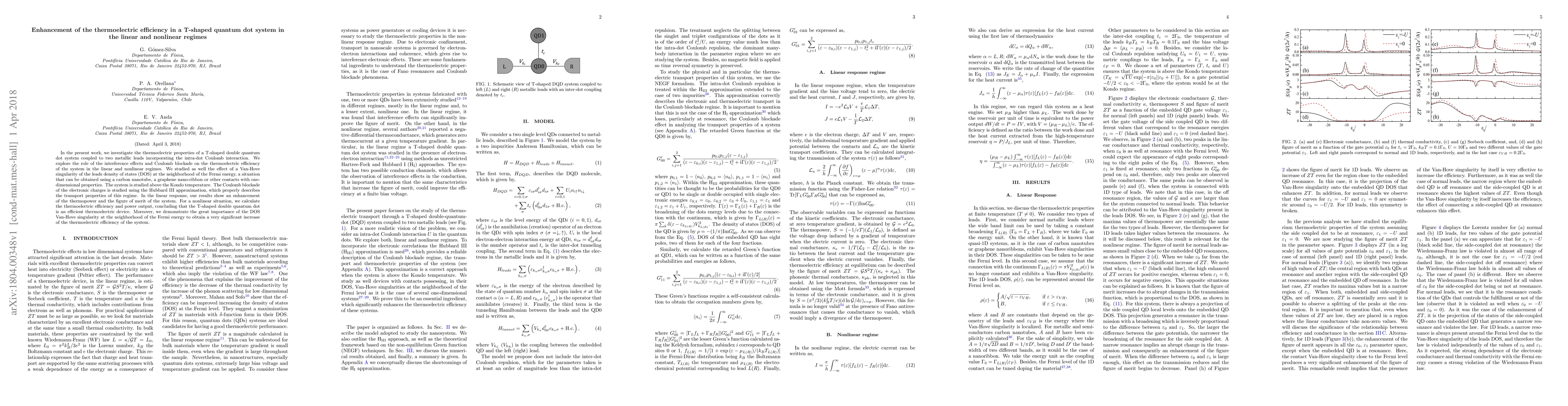 This paper investigates the thermoelectric efficiency of a T-shaped double quantum dot system, showing enhanced thermopower and figure of merit in linear response. In nonlinear conditions, it demonstrates the system's efficiency and the significant impact of a Van-Hove singularity in the leads' density of states near the Fermi energy.