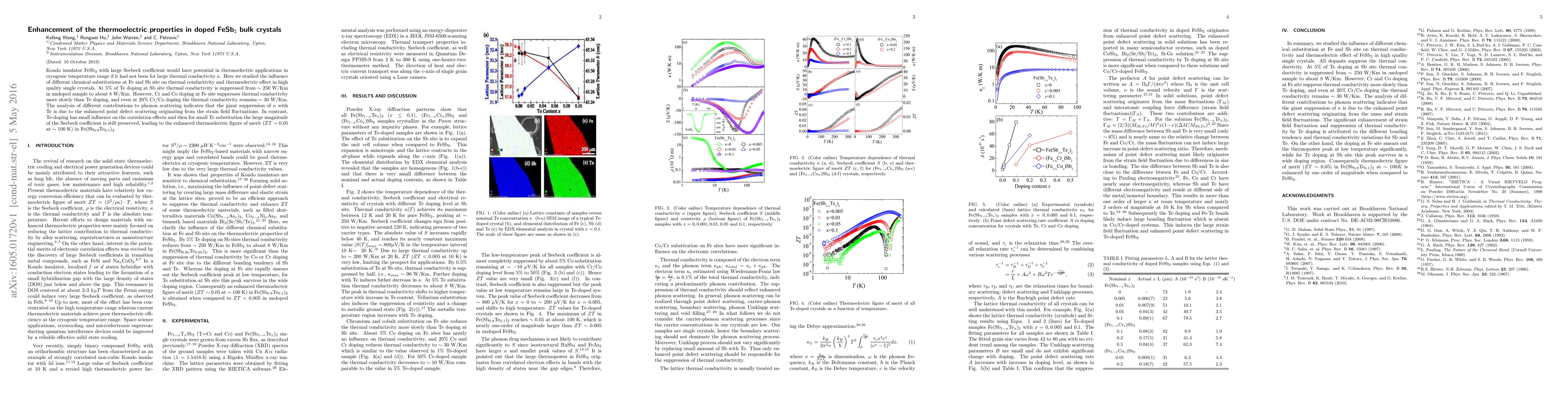 Kondo insulator FeSb$_2$ with large Seebeck coefficient would have potential in thermoelectric applications in cryogenic temperature range if it had not been for large thermal conductivity $\kappa$. Here we studied the influence of different chemical substitutions at Fe and Sb site on thermal conductivity and thermoelectric effect in high quality single crystals. At $5\%$ of Te doping at Sb site thermal conductivity is suppressed from $\sim 250$ W/Km in undoped sample to about 8 W/Km. However, Cr and Co doping at Fe site suppresses thermal conductivity more slowly than Te doping, and even at 20$\%$ Cr/Co doping the thermal conductivity remains $\sim 30$ W/Km. The analysis of different contributions to phonon scattering indicates that the giant suppression of $\kappa$ with Te is due to the enhanced point defect scattering originating from the strain field fluctuations. In contrast, Te-doping has small influence on the correlation effects and then for small Te substitution the large magnitude of the Seebeck coefficient is still preserved, leading to the enhanced thermoelectric figure of merit ($ZT\sim 0.05$ at $\sim 100$ K) in Fe(Sb$_{0.9}$Te$_{0.1}$)$_2$.