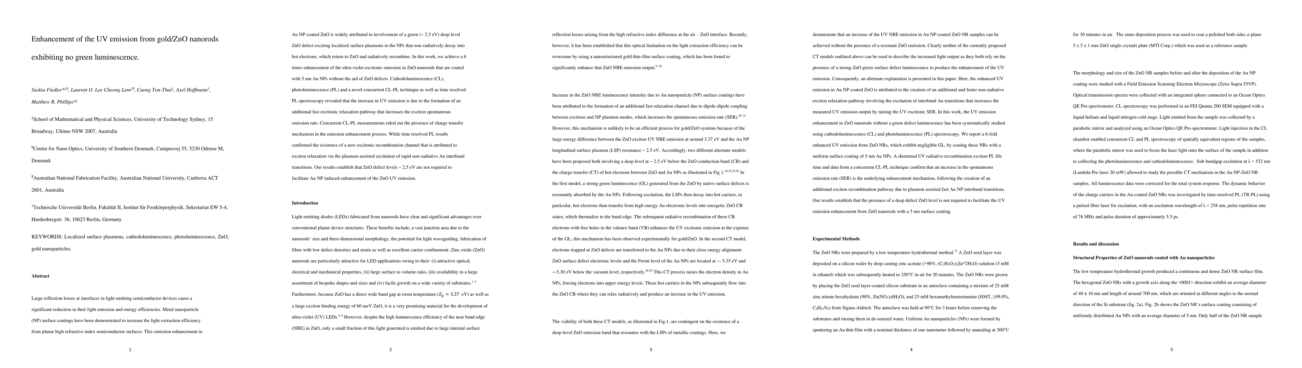 This study demonstrates a 6-fold enhancement of ultraviolet emission in ZnO nanorods coated with 5 nm gold nanoparticles, achieved without relying on ZnO defects. The enhancement is due to a new excitonic relaxation pathway, facilitated by plasmon-assisted excitation of rapid non-radiative gold interband transitions, as confirmed by various spectroscopic techniques.
