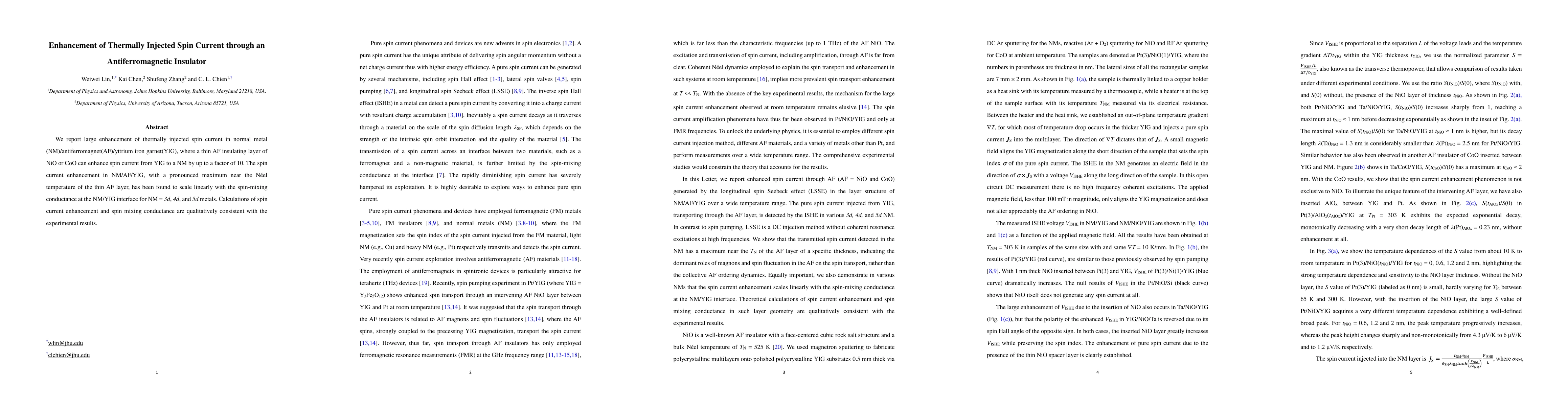 We report large enhancement of thermally injected spin current in normal metal (NM)/antiferromagnet(AF)/yttrium iron garnet(YIG), where a thin AF insulating layer of NiO or CoO can enhance spin current from YIG to a NM by up to a factor of 10. The spin current enhancement in NM/AF/YIG, with a pronounced maximum near the N\'eel temperature of the thin AF layer, has been found to scale linearly with the spin-mixing conductance at the NM/YIG interface for NM = 3d, 4d, and 5d metals. Calculations of spin current enhancement and spin mixing conductance are qualitatively consistent with the experimental results.