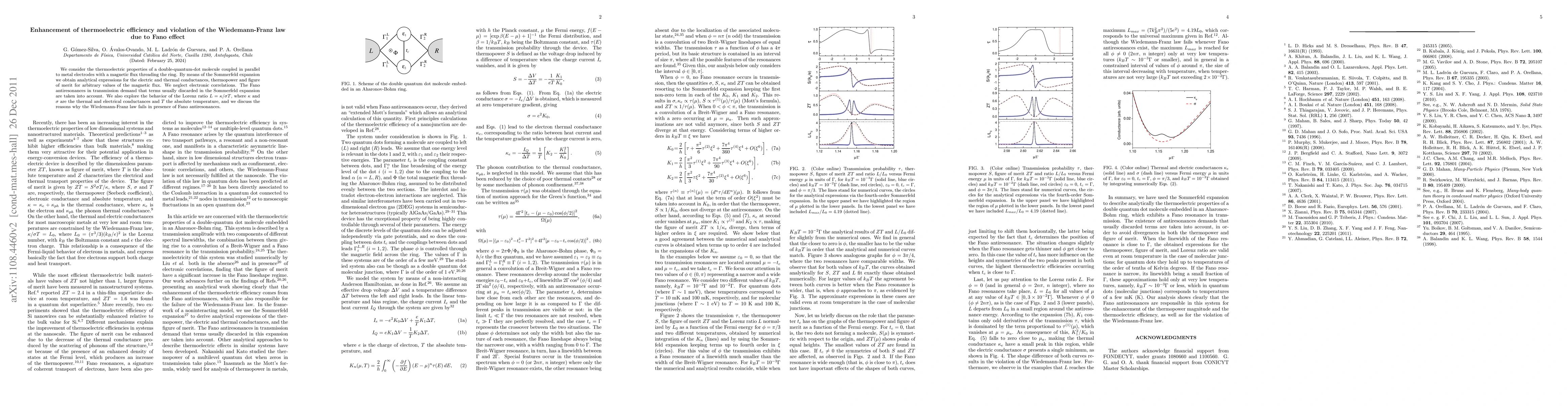This paper investigates the thermoelectric efficiency of a double-quantum-dot molecule under magnetic flux, revealing that Fano antiresonances necessitate reconsideration of typically discarded terms in conductance calculations. It also explores the violation of the Wiedemann-Franz law due to these antiresonances.