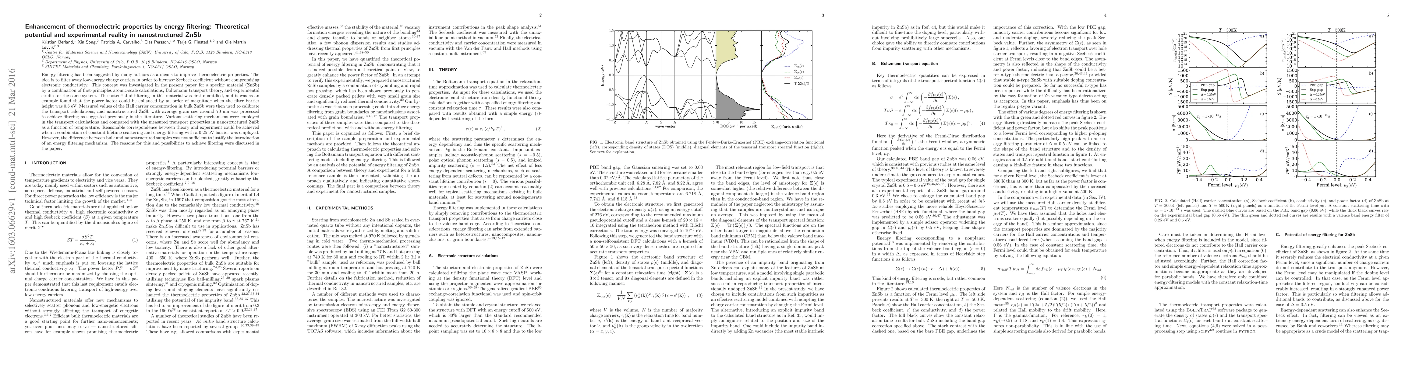 Energy filtering has been suggested by many authors as a means to improve thermoelectric properties. The idea is to filter away low-energy charge carriers in order to increase Seebeck coefficient without compromising electronic conductivity. This concept was investigated in the present paper for a specific material (ZnSb) by a combination of first-principles atomic-scale calculations, Boltzmann transport theory, and experimental studies of the same system. The potential of filtering in this material was first quantified, and it was as an example found that the power factor could be enhanced by an order of magnitude when the filter barrier height was 0.5~eV. Measured values of the Hall carrier concentration in bulk ZnSb were then used to calibrate the transport calculations, and nanostructured ZnSb with average grain size around 70~nm was processed to achieve filtering as suggested previously in the literature. Various scattering mechanisms were employed in the transport calculations and compared with the measured transport properties in nanostructured ZnSb as a function of temperature. Reasonable correspondence between theory and experiment could be achieved when a combination of constant lifetime scattering and energy filtering with a 0.25~eV barrier was employed. However, the difference between bulk and nanostructured samples was not sufficient to justify the introduction of an energy filtering mechanism. The reasons for this and possibilities to achieve filtering were discussed in the paper.