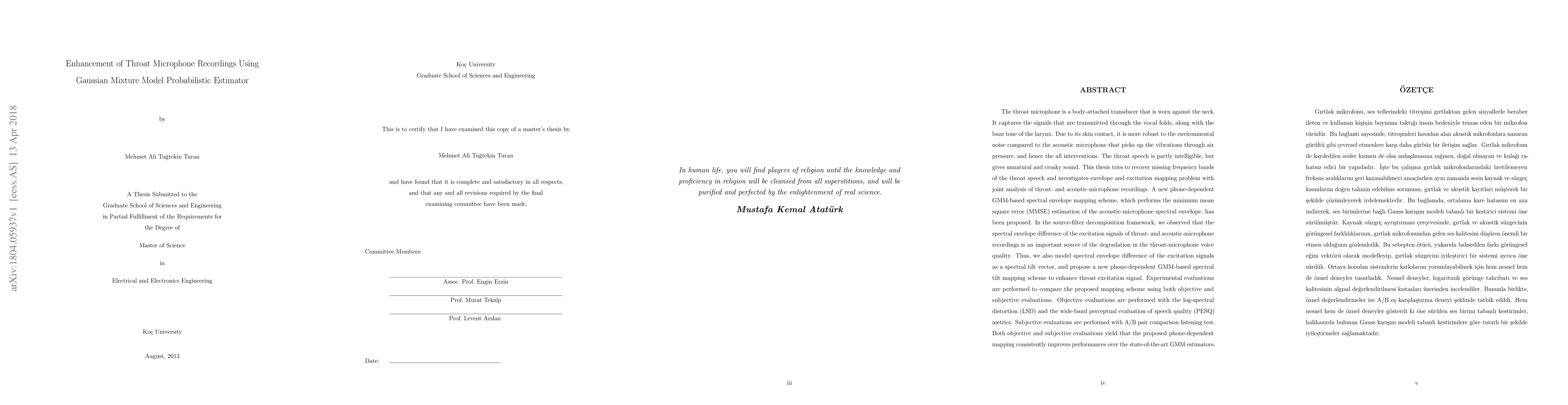 The throat microphone is a body-attached transducer that is worn against the neck. It captures the signals that are transmitted through the vocal folds, along with the buzz tone of the larynx. Due to its skin contact, it is more robust to the environmental noise compared to the acoustic microphone that picks up the vibrations through air pressure, and hence the all interventions. The throat speech is partly intelligible, but gives unnatural and croaky sound. This thesis tries to recover missing frequency bands of the throat speech and investigates envelope and excitation mapping problem with joint analysis of throat- and acoustic-microphone recordings. A new phone-dependent GMM-based spectral envelope mapping scheme, which performs the minimum mean square error (MMSE) estimation of the acoustic-microphone spectral envelope, has been proposed. In the source-filter decomposition framework, we observed that the spectral envelope difference of the excitation signals of throat- and acoustic-microphone recordings is an important source of the degradation in the throat-microphone voice quality. Thus, we also model spectral envelope difference of the excitation signals as a spectral tilt vector, and propose a new phone-dependent GMM-based spectral tilt mapping scheme to enhance throat excitation signal. Experimental evaluations are performed to compare the proposed mapping scheme using both objective and subjective evaluations. Objective evaluations are performed with the log-spectral distortion (LSD) and the wide-band perceptual evaluation of speech quality (PESQ) metrics. Subjective evaluations are performed with A/B pair comparison listening test. Both objective and subjective evaluations yield that the proposed phone-dependent mapping consistently improves performances over the state-of-the-art GMM estimators.