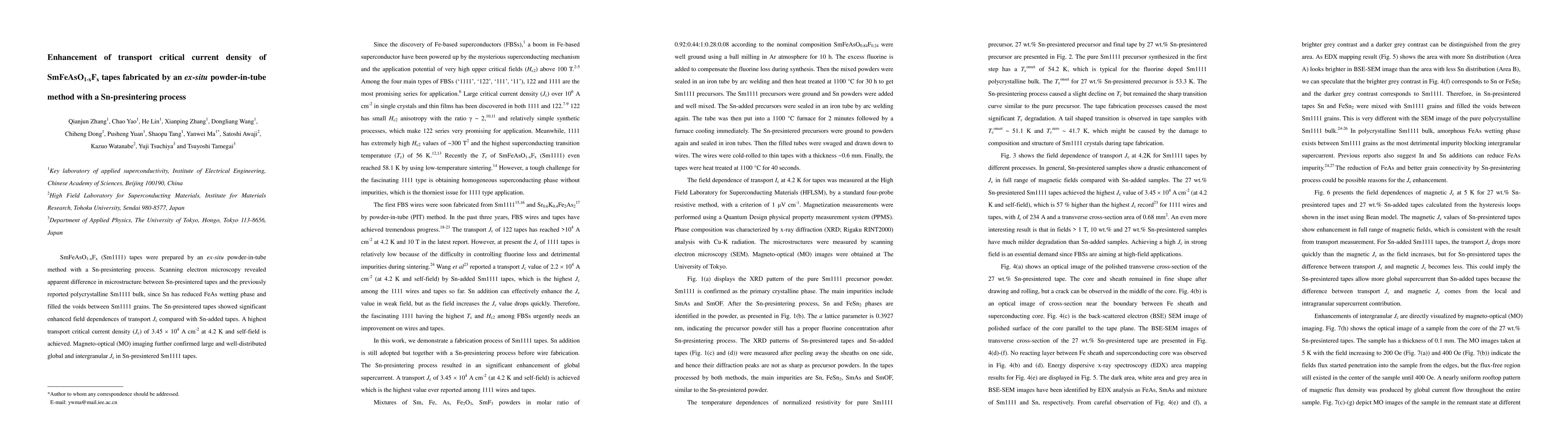 This study enhances the transport critical current density of SmFeAsO1-xFx tapes using a Sn-presintering process, revealing improved microstructure and significantly higher Jc values, achieving 3.45x10^4 A cm-2 at 4.2 K in self-field conditions. Magneto-optical imaging confirms the large and well-distributed critical current density in the Sn-presintered tapes.