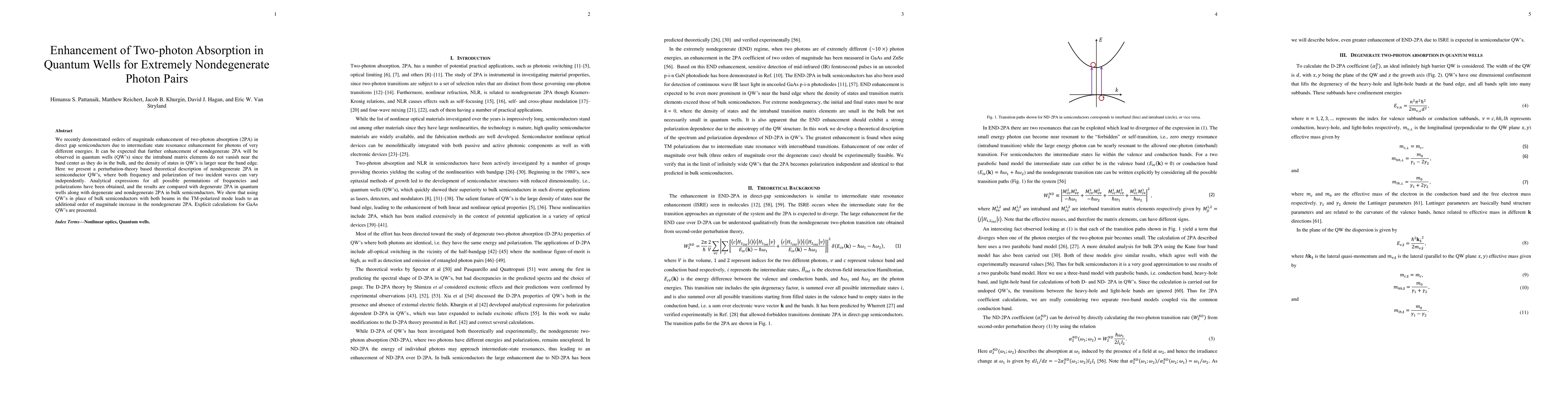 We recently demonstrated orders of magnitude enhancement of two-photon absorption (2PA) in direct gap semiconductors due to intermediate state resonance enhancement for photons of very different energies. It can be expected that further enhancement of nondegenerate 2PA will be observed in quantum wells (QWs) since the intraband matrix elements do not vanish near the band center as they do in the bulk, and the density of states in QWs is larger near the band edge. Here we present a perturbation-theory based theoretical description of nondegenerate 2PA in semiconductor QWs, where both frequency and polarization of two incident waves can vary independently. Analytical expressions for all possible permutations of frequencies and polarizations have been obtained, and the results are compared with degenerate 2PA in quantum wells along with degenerate and nondegenerate 2PA in bulk semiconductors. We show that using QWs in place of bulk semiconductors with both beams in the TM-polarized mode leads to an additional order of magnitude increase in the nondegenerate 2PA. Explicit calculations for GaAs QWs are presented.