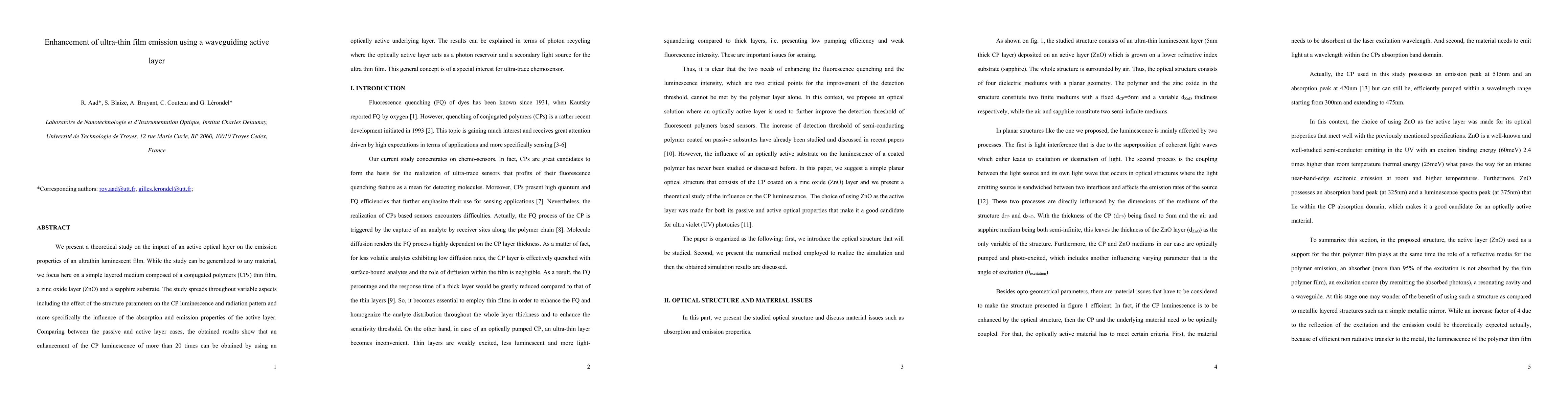 We present a theoretical study on the impact of an active optical layer on the emission properties of an ultrathin luminescent film. While the study can be generalized to any material, we focus here on a simple layered medium composed of a conjugated polymers (CPs) thin film, a zinc oxide layer (ZnO) and a sapphire substrate. The study spreads throughout variable aspects including the effect of the structure parameters on the CP luminescence and radiation pattern and more specifically the influence of the absorption and emission properties of the active layer. Comparing between the passive and active layer cases, the obtained results show that an enhancement of the CP luminescence of more than 20 times can be obtained by using an optically active underlying layer. The results can be explained in terms of photon recycling where the optically active layer acts as a photon reservoir and a secondary light source for the ultra thin film. This general concept is of a special interest for ultra-trace chemosensor.
