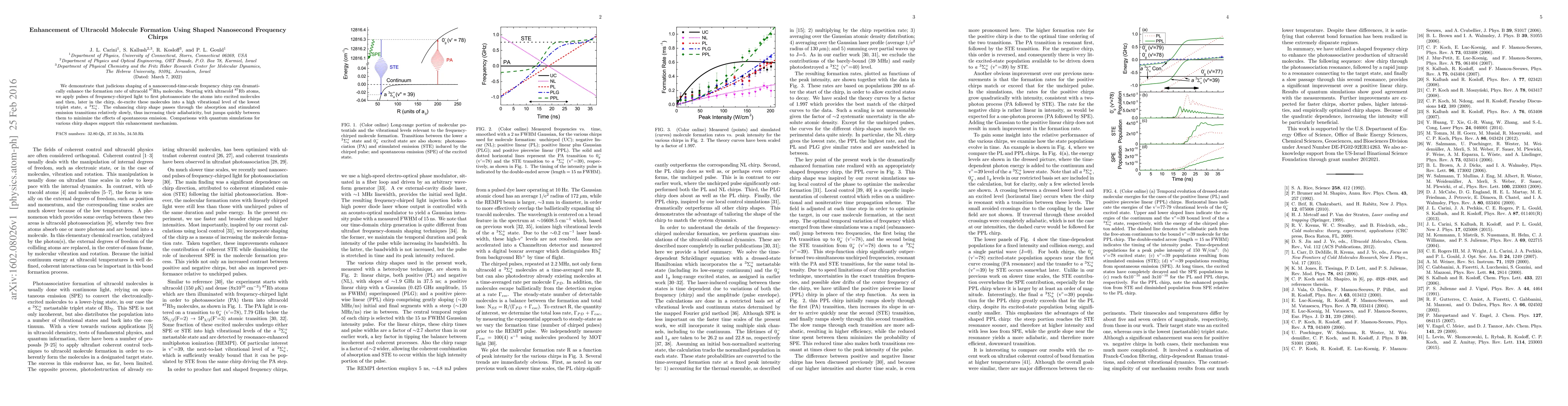 This study shows that shaped nanosecond frequency chirps significantly boost the formation of ultracold $^{87}$Rb$_{2}$ molecules by enhancing the photoassociation and de-excitation processes. Quantum simulations corroborate that the optimal chirp shape increases adiabaticity while minimizing spontaneous emission effects.