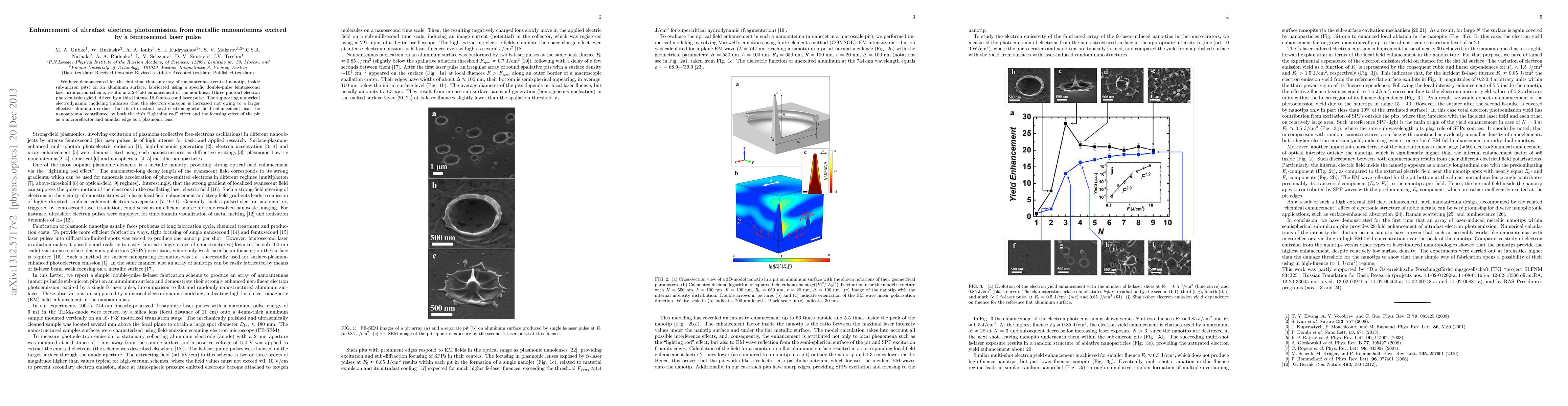 We have demonstrated for the first time that an array of nanoantennas (central nanotips inside sub-micron pits) on an aluminum surface, fabricated using a specific double-pulse femtosecond laser irradiation scheme, results in a 28-fold enhancement of the non-linear (three-photon) electron photoemission yield, driven by a third intense IR femtosecond laser pulse. The supporting numerical electrodynamic modeling indicates that the electron emission is increased not owing to a larger effective aluminum surface, but due to instant local electromagnetic field enhancement near the nanoantenna, contributed by both the tip's lightning rod effect and the focusing effect of the pit as a microreflector and annular edge as a plasmonic lens.