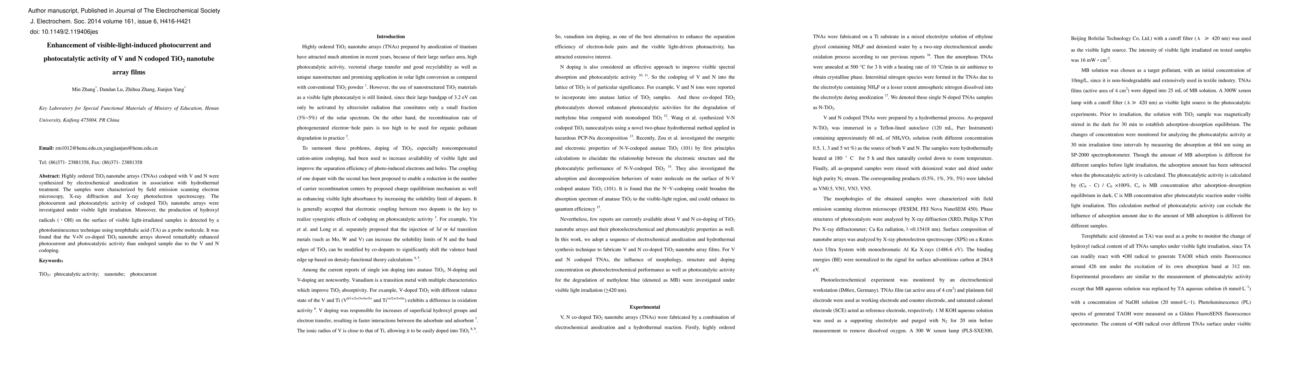 This study synthesized V and N codoped TiO2 nanotube arrays via electrochemical anodization and hydrothermal treatment, showing significantly improved visible-light-induced photocurrent and photocatalytic activity compared to undoped samples. Enhanced performance is attributed to the synergistic effects of V and N codoping.